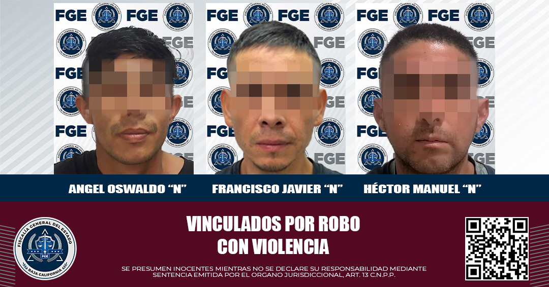 MEXICALI, BAJA CALIFORNIA. - Tres hombres fueron vinculados a proceso por su presunta participación en robos con violencia, gracias al trabajo de investigación realizado por la Fiscalía Regional de Mexicali, a través de la Unidad de Investigación de Robos Oriente.