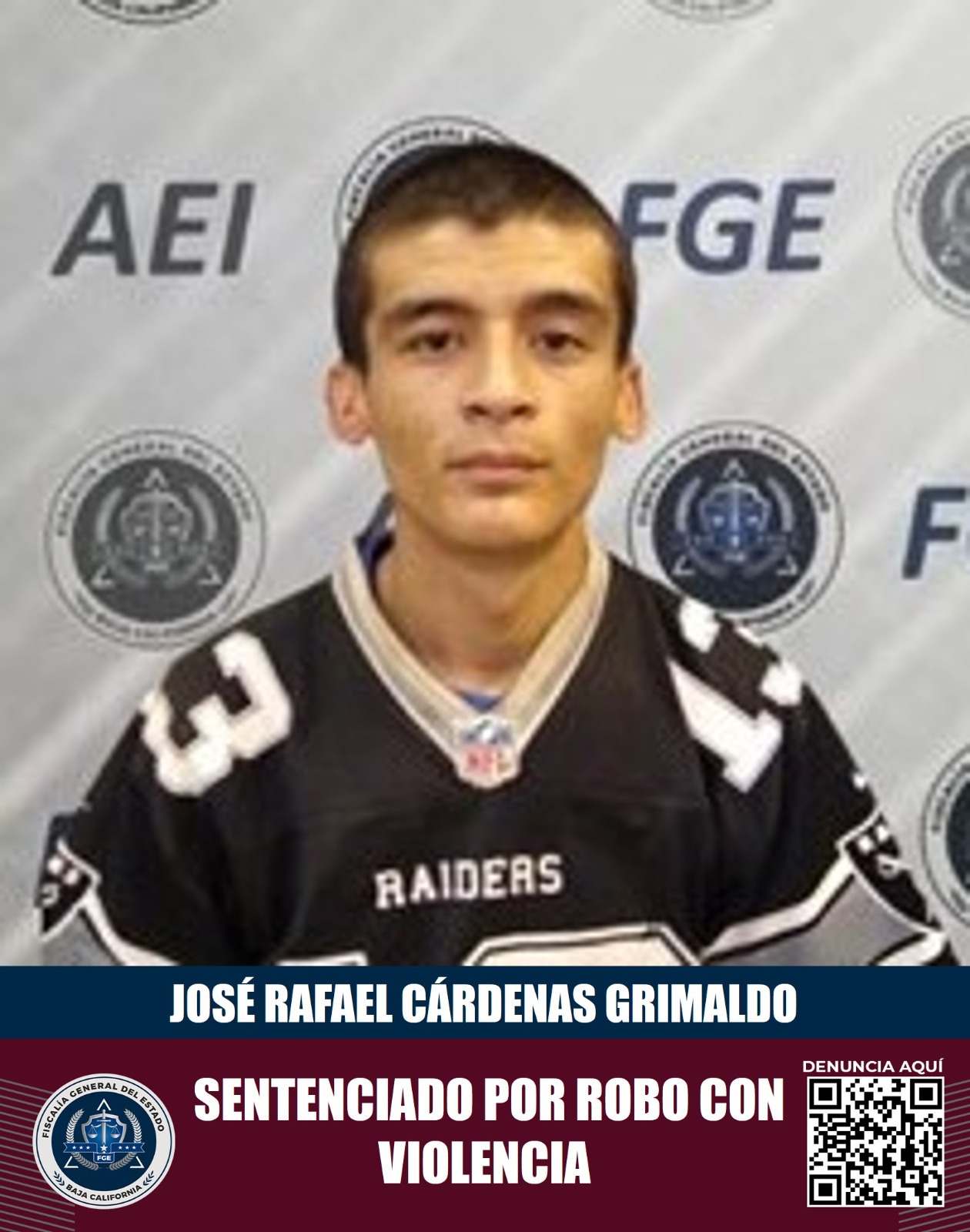 MEXICALI, BAJA CALIFORNIA. - La Fiscalía Regional de Mexicali a través de la Unidad de Investigación de Robos Poniente obtuvo una pena de más de 25 años de prisión en contra de José Rafael Cárdenas Grimaldo, quien aceptó su responsabilidad en el delito de robo calificado cometido a establecimiento comercial abierto al público con violencia.