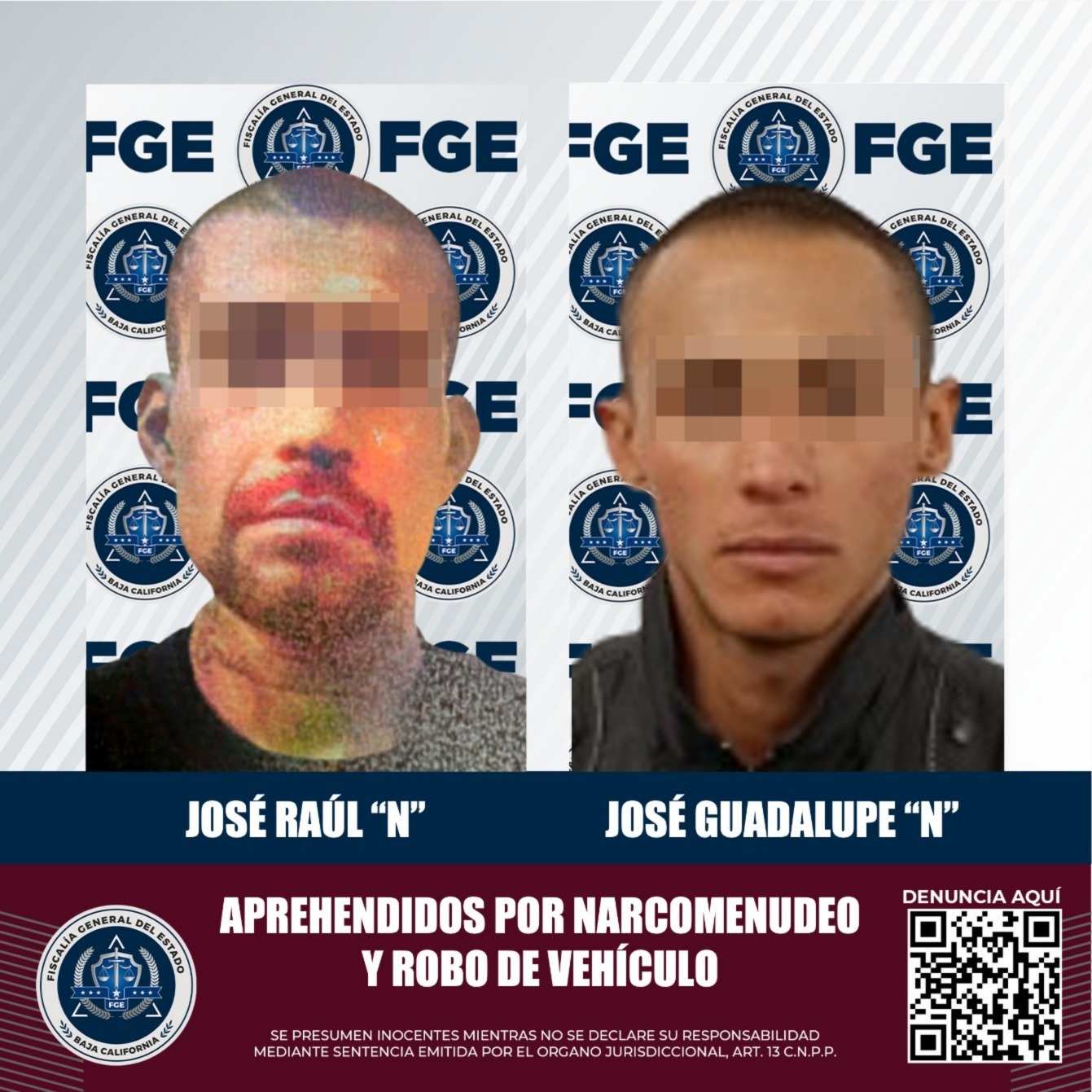 TECATE, BAJA CALIFORNIA. - La Agencia Estatal de Investigación de la Fiscalía Regional de Tecate, cumplimentó dos mandatos judiciales que pesaban en contra de José Raúl “N” y José Guadalupe “N”, quienes en hechos por separado están siendo acusados de narcomenudeo y robo de vehículo, en este municipio.