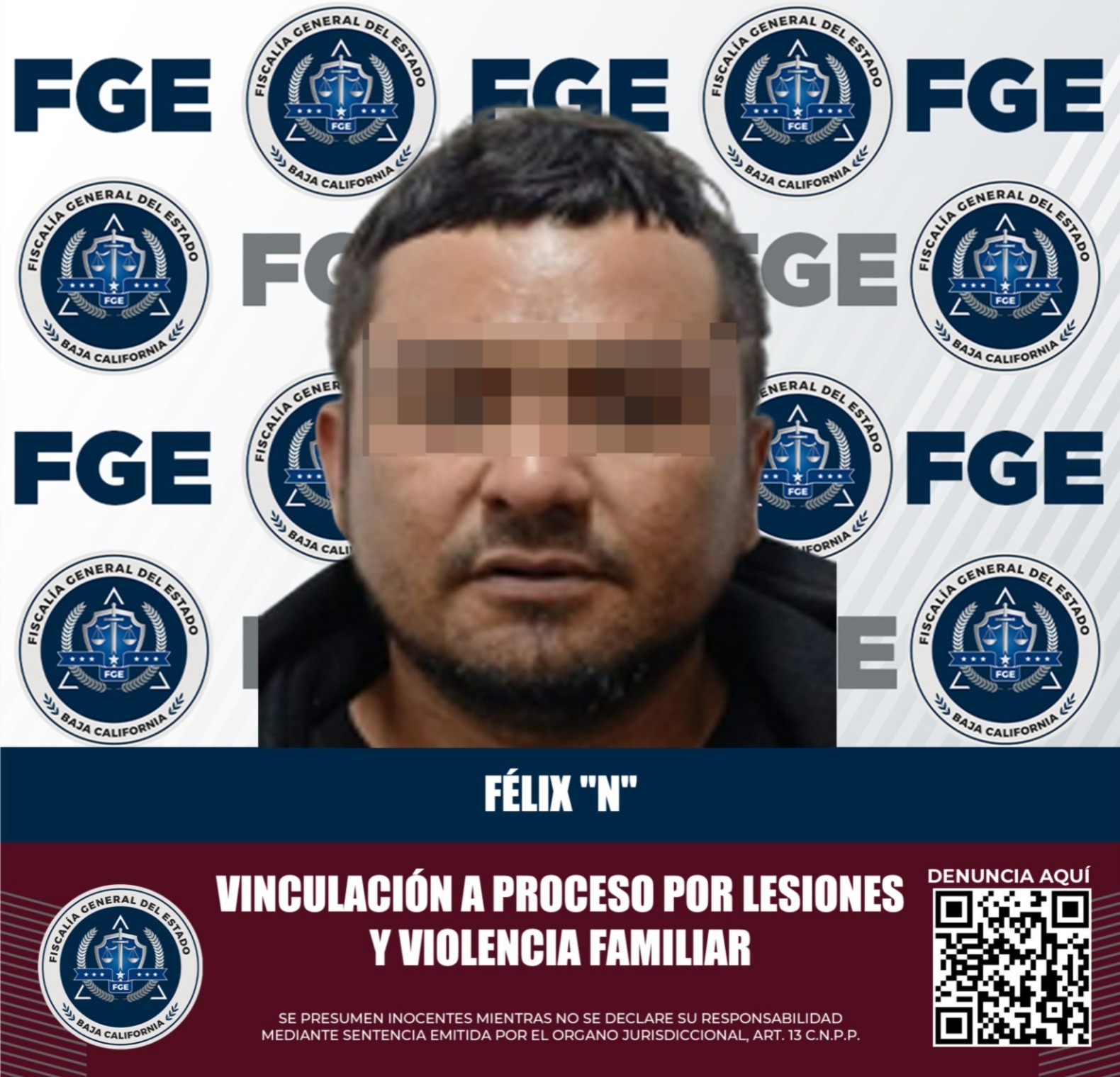 TIJUANA, BAJA CALIFORNIA. - La Fiscalía General del Estado de Baja California informa que, derivado de los medios de prueba presentados por el Ministerio Público, tales como haber sido capturado por agentes primeros respondientes en flagrancia, un Juez de Control determinó vincular a proceso a Félix “N” por los delitos de lesiones y violencia familiar.