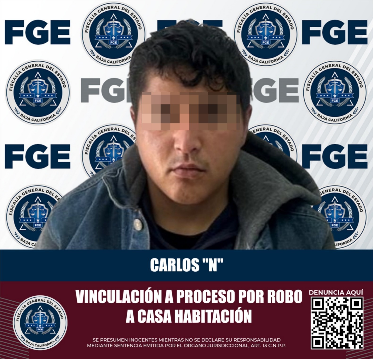 PLAYAS DE ROSARITO, BAJA CALIFORNIA. - La Fiscalía General del Estado, a través de la Unidad Especializada en Robos de Playas de Rosarito, informa sobre la vinculación a proceso de Carlos “N” por su presunta participación en el delito de robo calificado a casa habitación.