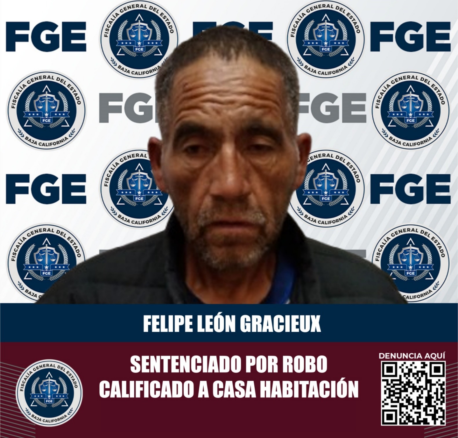 ENSENADA, BAJA CALIFORNIA. - La Fiscalía Regional de Ensenada logró una sentencia de 5 años y 4 meses de prisión contra Felipe León Gracieux por el delito de robo calificado en casa habitación, resultado de una efectiva labor por parte de la Unidad de Investigación de Robos.
