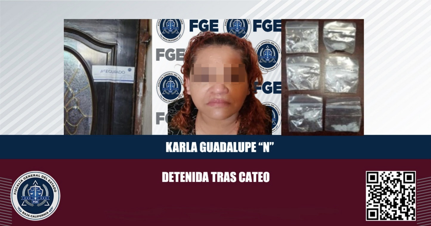 MEXICALI, BAJA CALIFORNIA. - Elementos de la Fiscalía General del Estado (FGE), ejecutaron un cateo logrando el aseguramiento de Karla Guadalupe "N", presunta narcomenudista y el decomiso de varias dosis de droga.