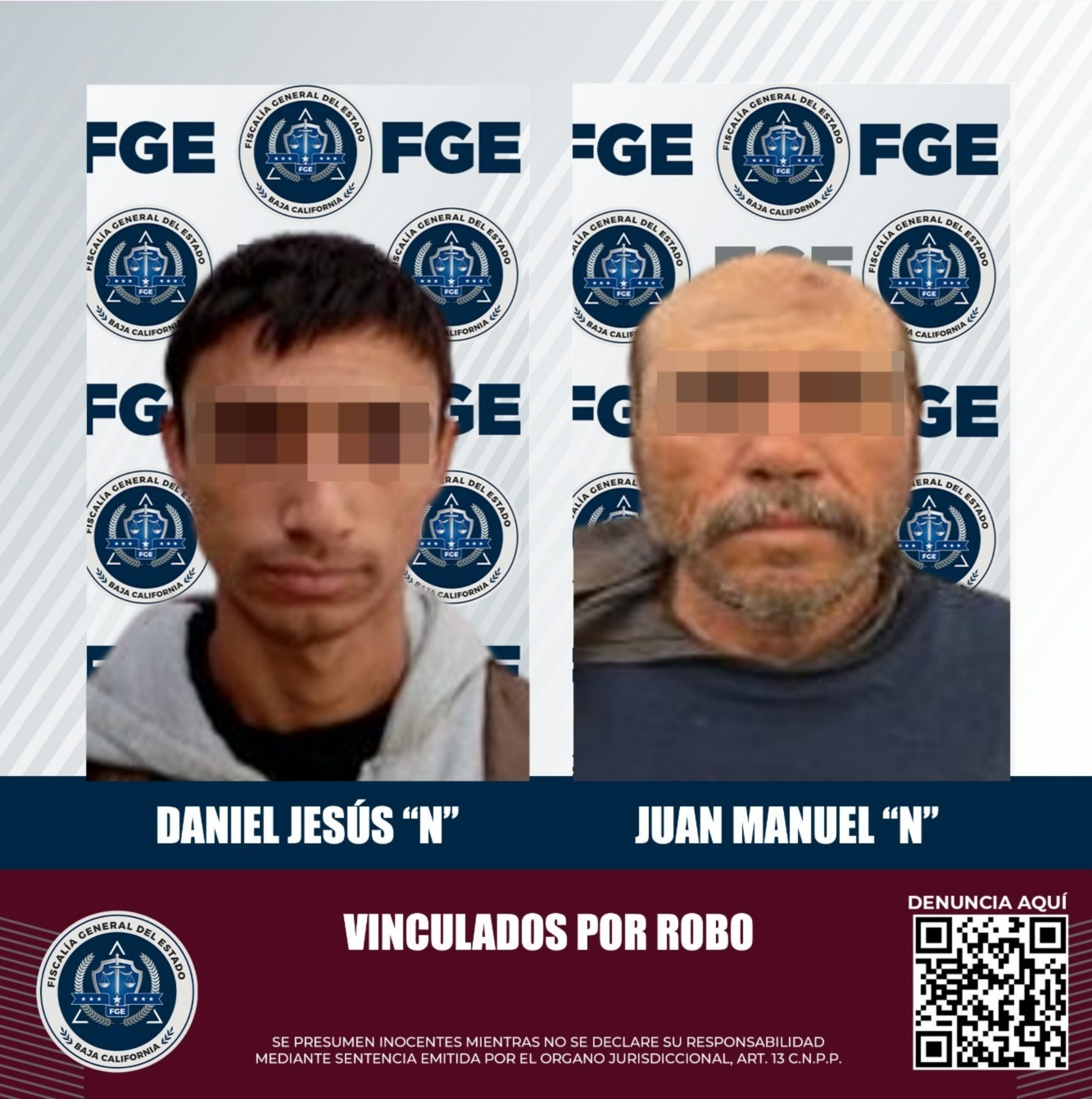 MEXICALI, BAJA CALIFORNIA. - La Fiscalía Regional de Mexicali logró, en audiencias celebradas por separado, la vinculación a proceso de dos hombres acusados del delito de robo calificado a establecimiento comercial abierto al público con violencia y robo de cableado, respectivamente.
