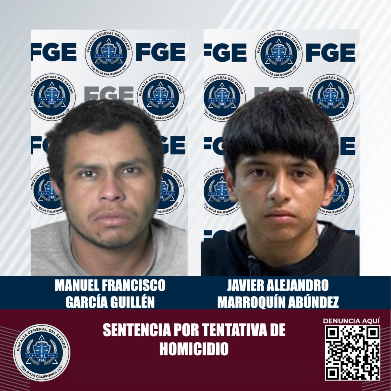 TIJUANA, BAJA CALIFORNIA. - La Fiscalía Especializada en Delitos Contra la Vida, logró que se impusiera la pena de 13 años 4 meses de prisión a Manuel Francisco García Guillén y a Javier Alejandro Marroquín Abúndez alias “Javier Alejandro Abúndez Luna”, quienes en el mismo hecho fueron encontrados responsables del delito homicidio calificado en su grado de ejecución de tentativa.