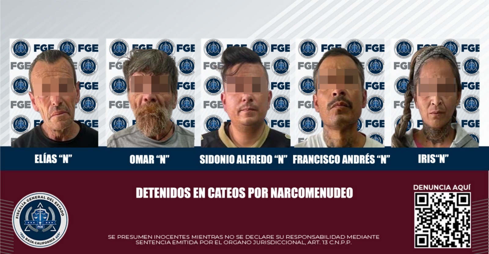 PLAYAS DE ROSARITO, BAJA CALIFORNIA. - La Fiscalía General del Estado, a través del Ministerio Público de la Fiscalía Especializada en Narcomenudeo, logró la detención de cinco personas durante la realización de dos cateos realizados en esta ciudad.