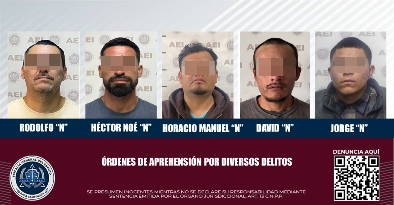 ENSENADA, BAJA CALIFORNIA. - La Fiscalía General del Estado, a través de agentes de la Agencia Estatal de Investigación, llevó a cabo órdenes de aprehensión contra cinco sujetos en diferentes casos, como resultado de investigaciones relacionadas con diversos delitos.