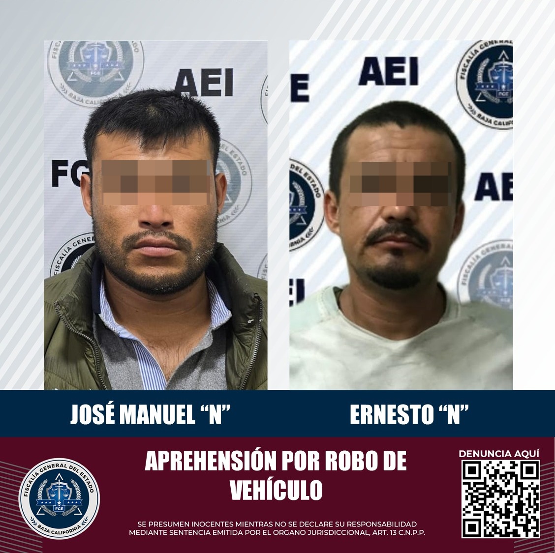 TIJUANA, BAJA CALIFORNIA. - Gracias a las labores de inteligencia de la Fiscalía General del Estado de Baja California (FGEBC), realizadas tanto en gabinete como en campo, se ejecutaron dos órdenes de aprehensión en contra de dos hombres por su presunta participación en el delito de robo de vehículo en situaciones distintas.