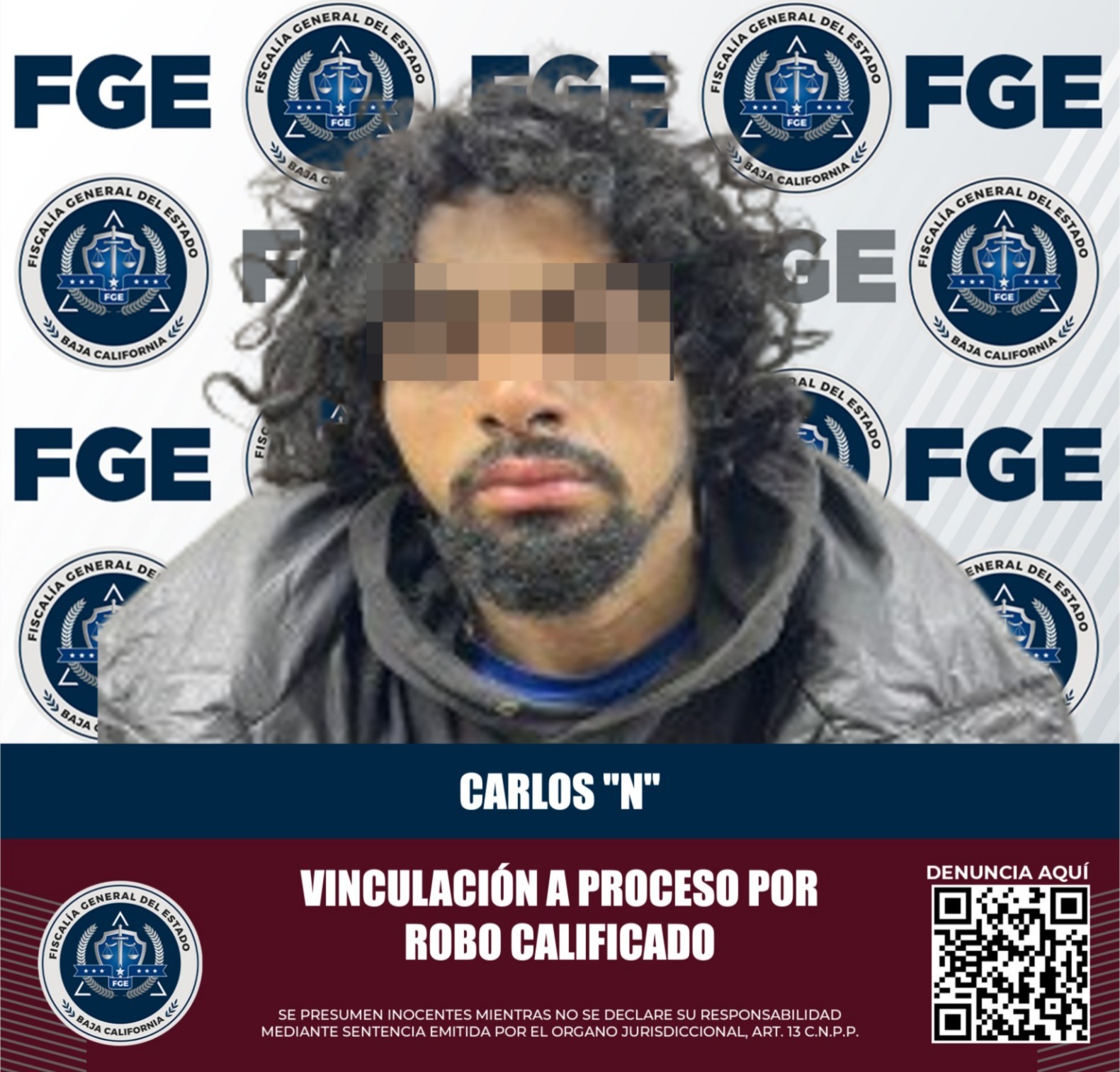 TIJUANA, BAJA CALIFORNIA. - La Fiscalía Regional de Tijuana, informa que, gracias al trabajo de inteligencia y presentación de datos de prueba, se logró la obtención de vinculación a proceso en contra de Carlos “N”, acusado del delito de robo calificado cometido de noche.