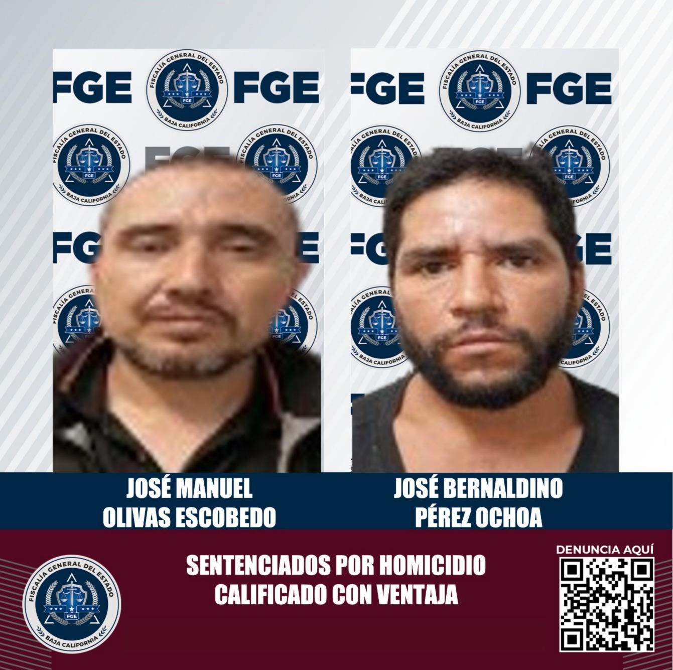 TIJUANA, BAJA CALIFORNIA. - La Fiscalía General del Estado a través de la Fiscalía Especializada en Delitos Contra la Vida, informa que José Manuel Olivas Escobedo y José Bernaldino Pérez Ochoa han sido condenados a 35 años 8 meses de prisión, luego de un procedimiento abreviado por el delito de homicidio calificado con ventaja.