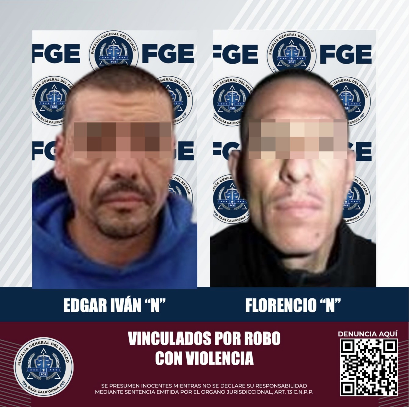 MEXICALI, BAJA CALIFORNIA. - La Fiscalía Regional de Mexicali, a través de la Unidad de Investigación de Robos Poniente y Robos Oriente, logró vincular a proceso a dos personas por su presunta responsabilidad en el delito de robo con violencia.