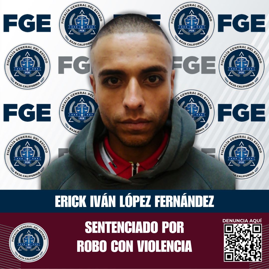 ENSENADA, BAJA CALIFORNIA. - La Fiscalía Regional de Ensenada obtuvo una sentencia condenatoria contra Erick Iván López Fernández, quien fue declarado culpable del delito de robo calificado cometido de noche por dos o más personas y ejecutado con violencia.