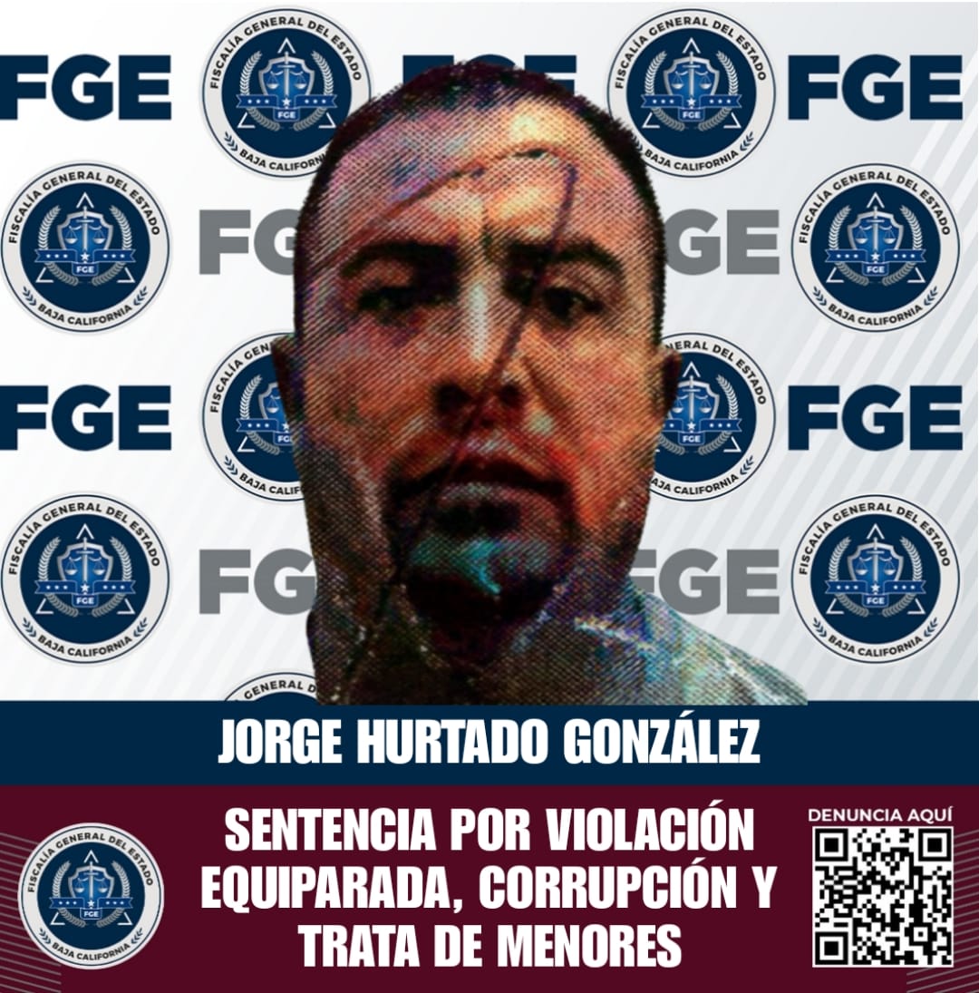 TIJUANA, BAJA CALIFORNIA. - La Fiscalía Regional de Tijuana, a través de la Coordinación de Averiguaciones Previas y Control de Procesos logró obtener la sentencia condenatoria de 50 años de prisión en contra de Jorge Hurtado González, por su responsabilidad en los delitos de corrupción de menores de dieciocho años, trata de personas menores de dieciocho años agravado y violación equiparada.