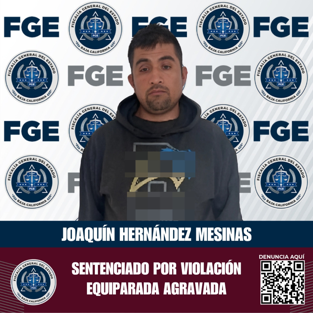 SAN QUINTÍN, BAJA CALIFORNIA. - La Fiscalía General del Estado (FGE) logró una condena de 20 años de prisión contra Joaquín Hernández Mesinas, declarado culpable del delito de violación equiparada agravada, en un caso que involucra a una menor de edad.