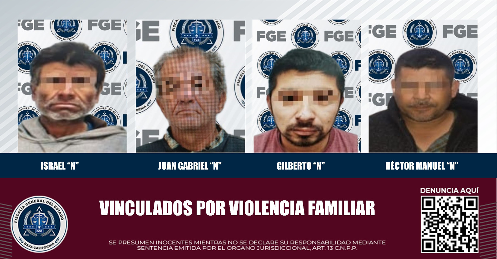 MEXICALI, BAJA CALIFORNIA. - La Fiscalía Regional de Mexicali logró la vinculación a proceso de cuatro hombres por el delito de violencia familiar, durante audiencias celebradas por separado. Los imputados fueron sujetos a prisión preventiva justificada como medida cautelar, mientras se les concede un plazo de tres meses para el cierre de la investigación complementaria.