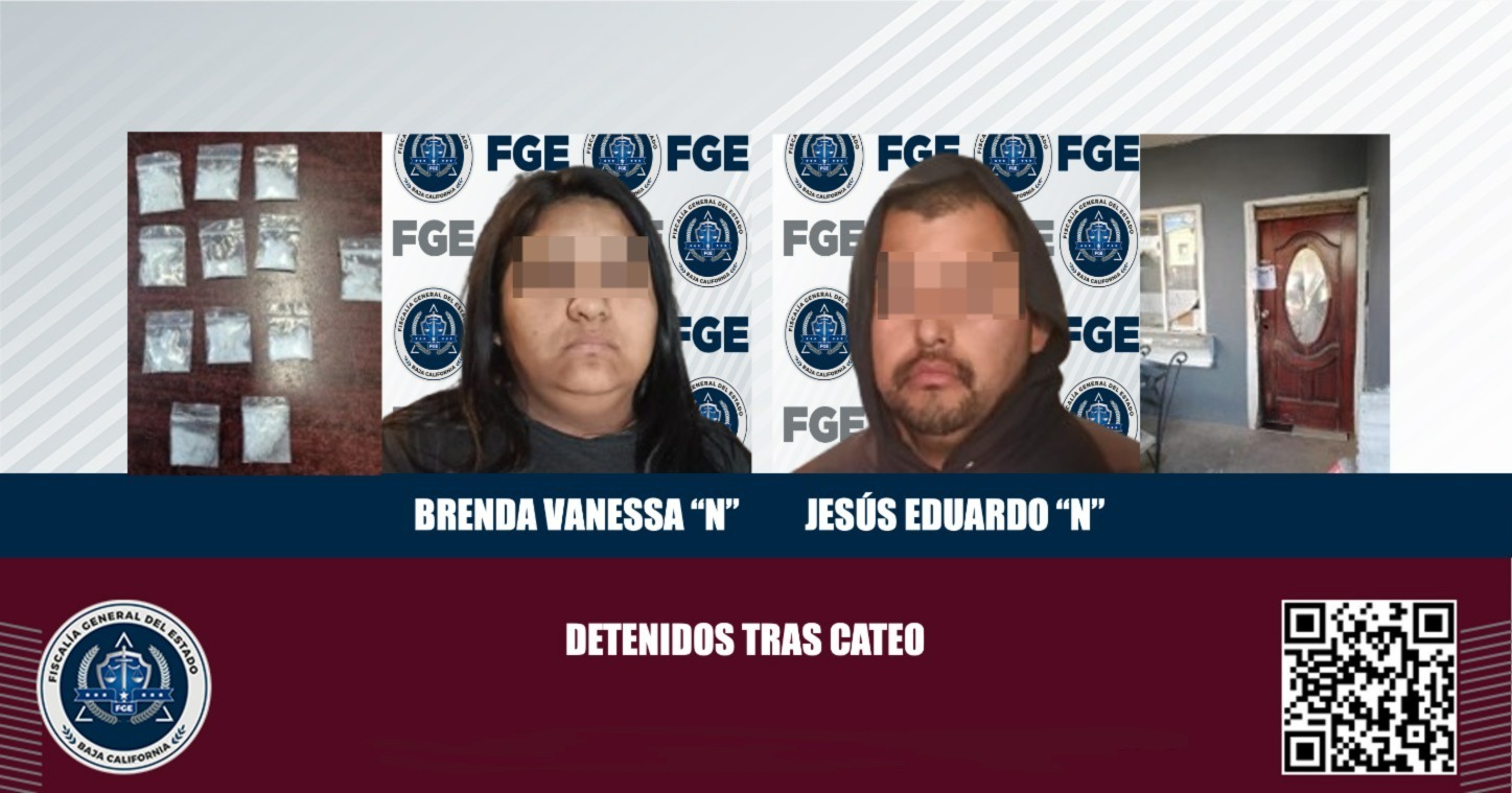 MEXICALI, BAJA CALIFORNIA. - Elementos de la Fiscalía General del Estado (FGE) ejecutaron un cateo, en donde lograron el aseguramiento de un hombre y una mujer con varias dosis de droga sintética.