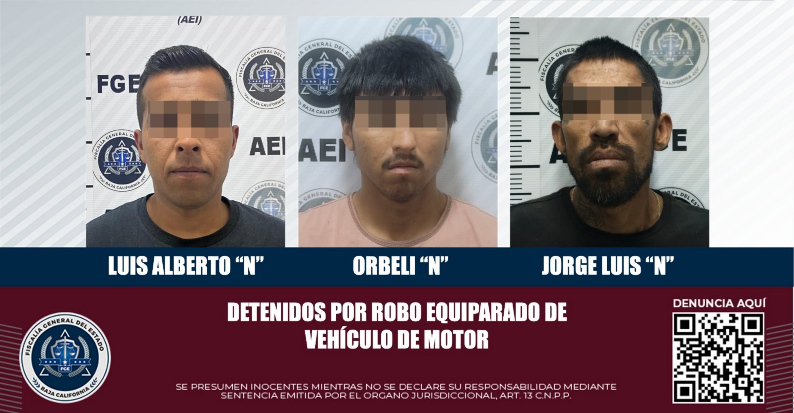 TIJUANA, BAJA CALIFORNIA. - La Fiscalía Regional de Tijuana a través de la Agencia Estatal de Investigación, informa sobre la detención de tres personas en distintos hechos con fecha del 20 de enero de 2025, quienes son presuntamente responsables del delito de robo equiparado de vehículo de motor en su modalidad de uso de vehículo de motor robado. Estas acciones refuerzan el compromiso de la FGE con la seguridad y justicia para los ciudadanos.