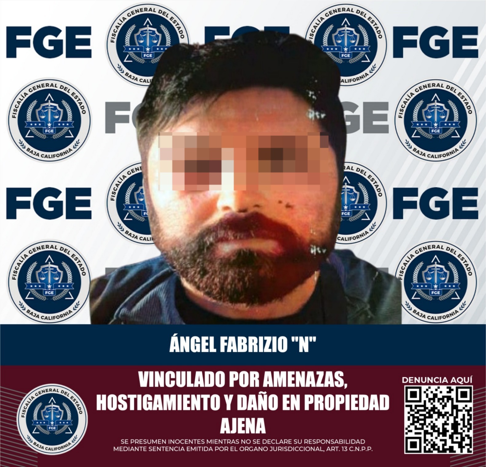 TIJUANA, BAJA CALIFORNIA. - Gracias al trabajo de investigación en gabinete y campo realizado por la Fiscalía Regional de Tijuana, a través de la Unidad de Investigación UTMC Zona Centro, se logró obtener la vinculación a proceso de Ángel Fabrizio “N”, por los delitos de amenazas, hostigamiento y daño en propiedad ajena intencional.