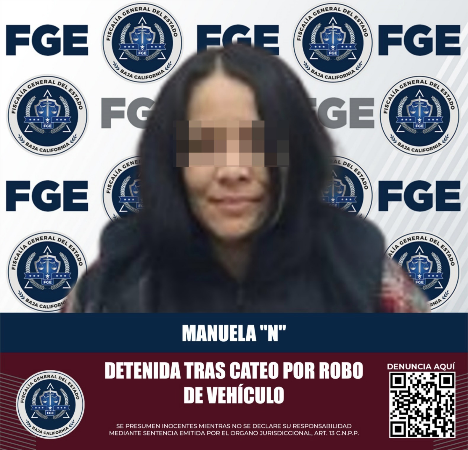 Así mismo, al interior del inmueble se encontraba una mujer que se identificó como Manuela “N”, quien fue asegurada por el delito de robo equiparado de vehículo de motor en la modalidad de poseer vehículo de motor robado.
