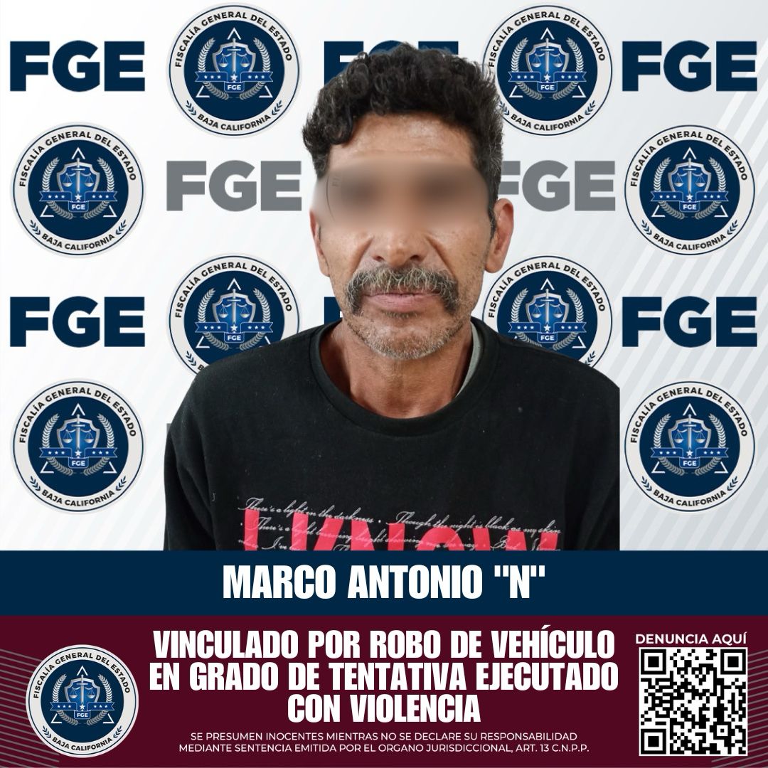 ENSENADA, BAJA CALIFORNIA. - La Fiscalía Regional de Ensenada informa sobre la vinculación a proceso de Marco Antonio “N”, de 56 años de edad, por su presunta participación en un intento de robo de vehículo con violencia.