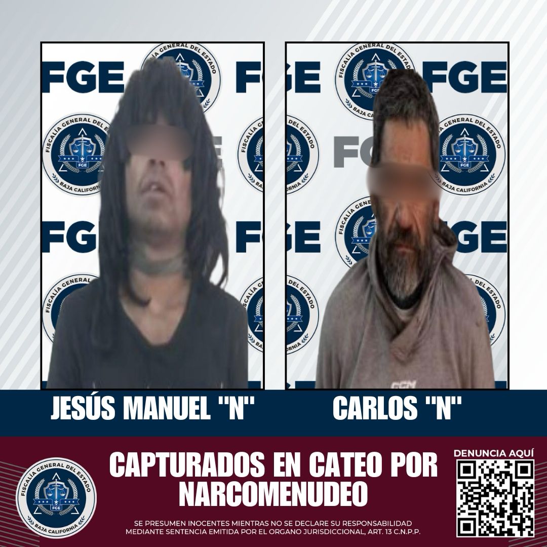 ENSENADA, BAJA CALIFORNIA. - La Fiscalía General del Estado informa que, en cumplimiento a una orden de cateo, se detuvo a dos individuos identificados como Jesús Manuel “N” y Carlos “N”, quienes fueron puestos a disposición del Ministerio Público por delitos contra la salud.