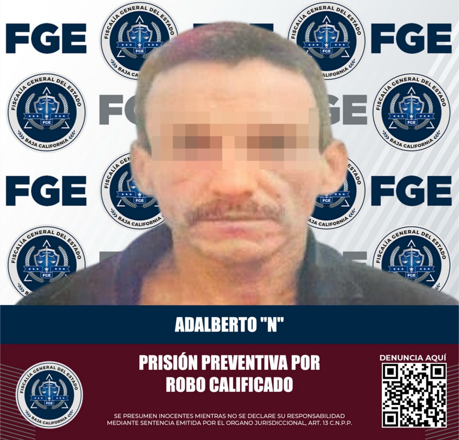 TIJUANA, BAJA CALIFORNIA. - Gracias a la presentación de datos de prueba contundentes, se logró imponer la medida cautelar de prisión preventiva justificada a Adalberto “N”, quien es señalado por su presunta responsabilidad en el delito de robo calificado cometido a lugar cerrado en su grado de ejecución de tentativa.
