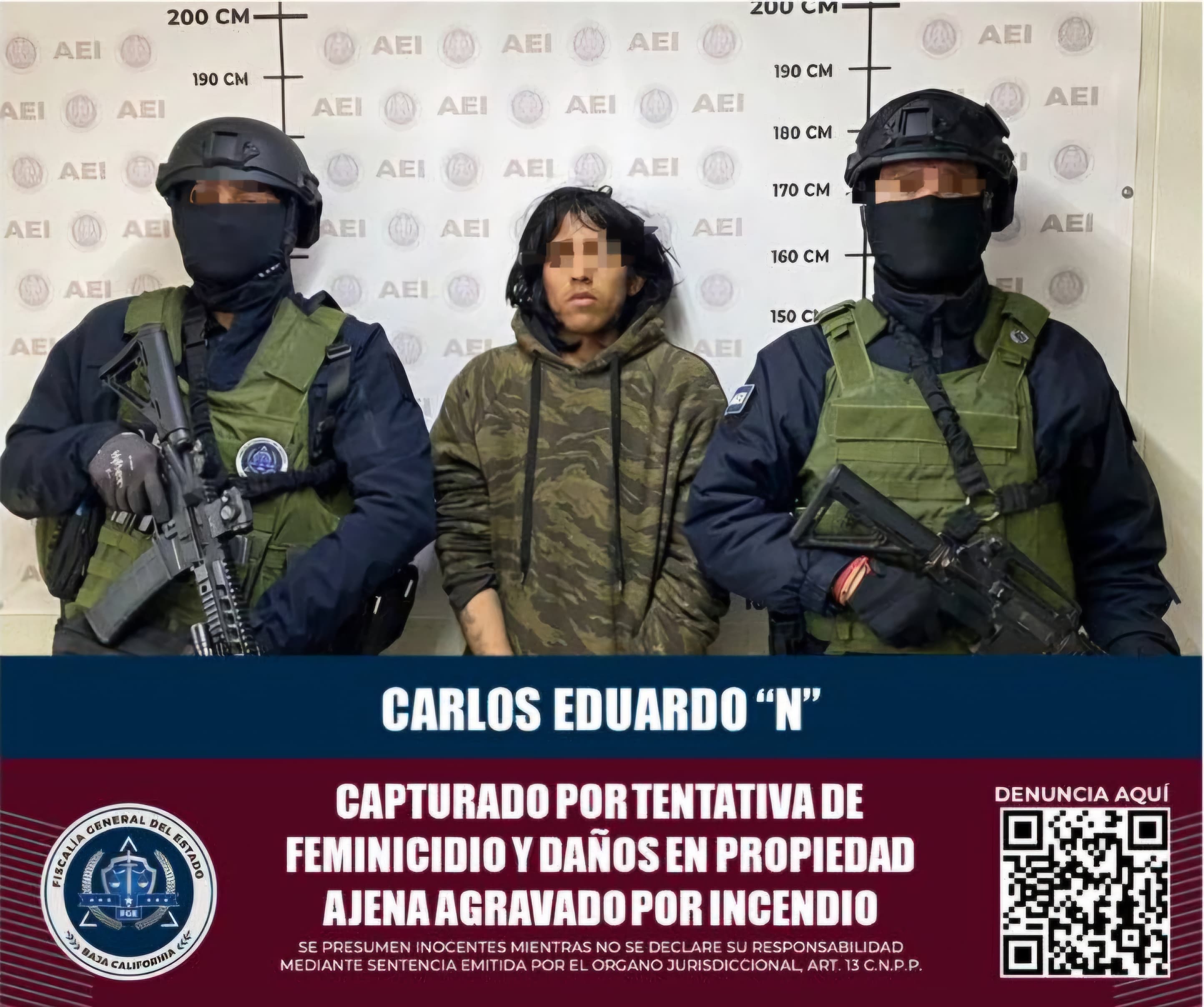 ENSENADA, BAJA CALIFORNIA. - Agentes de la Fiscalía General del Estado lograron la captura de Carlos Eduardo “N”, señalado como presunto autor de delitos de daño en propiedad ajena por incendio y tentativa de feminicidio, en incidente ocurrido en una vivienda de la colonia Invasión Aguajito.