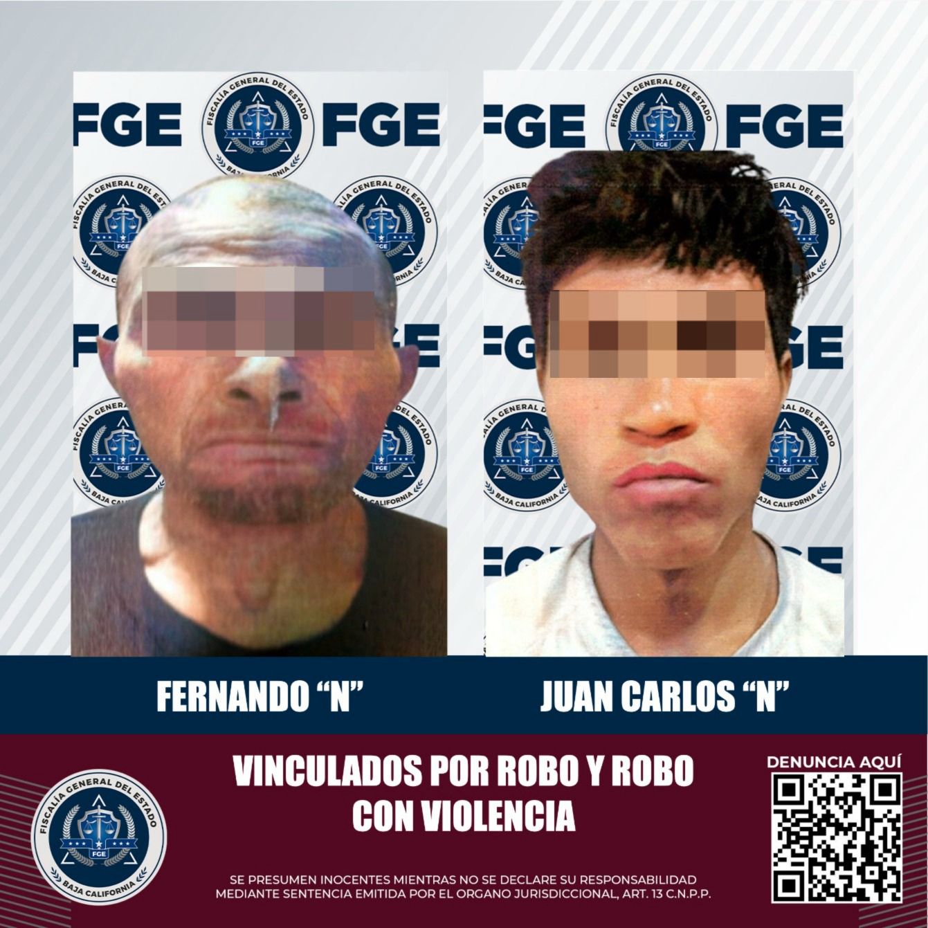 TIJUANA, BAJA CALIFORNIA. - La Fiscalía Regional de Tijuana, informa que gracias a la labor de investigación y presentación de datos de prueba contundentes se logró obtener la vinculación a proceso de dos masculinos, quienes están siendo señalados de cometer robo y robo con violencia.