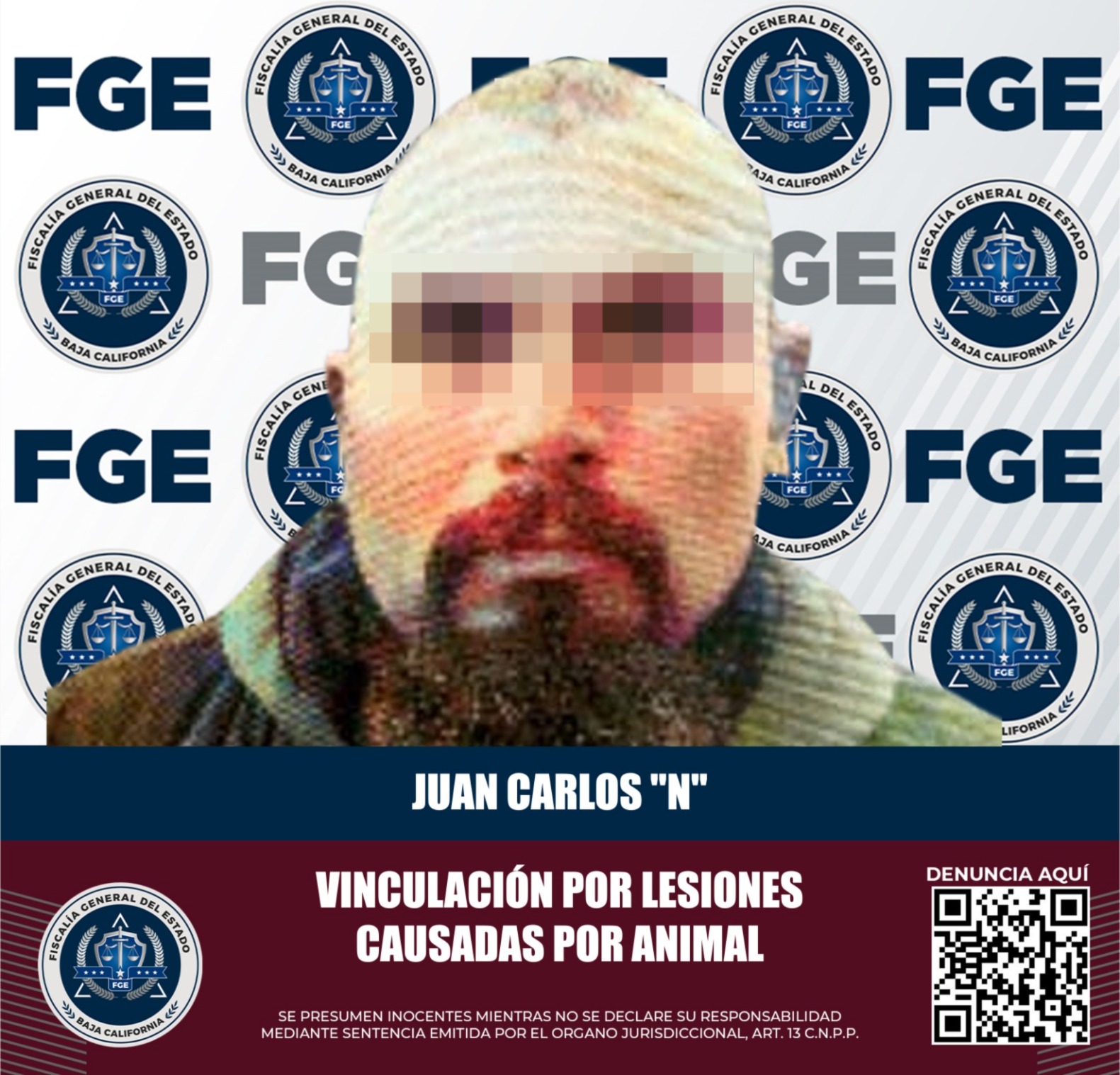TECATE, BAJA CALIFORNIA. - La Fiscalía Regional de Tecate, a través de la Unidad de Tramitación Masiva de Causas, informa que se logró la vinculación a proceso de Juan Carlos “N”, señalado de lesiones causadas por un animal, su mascota.