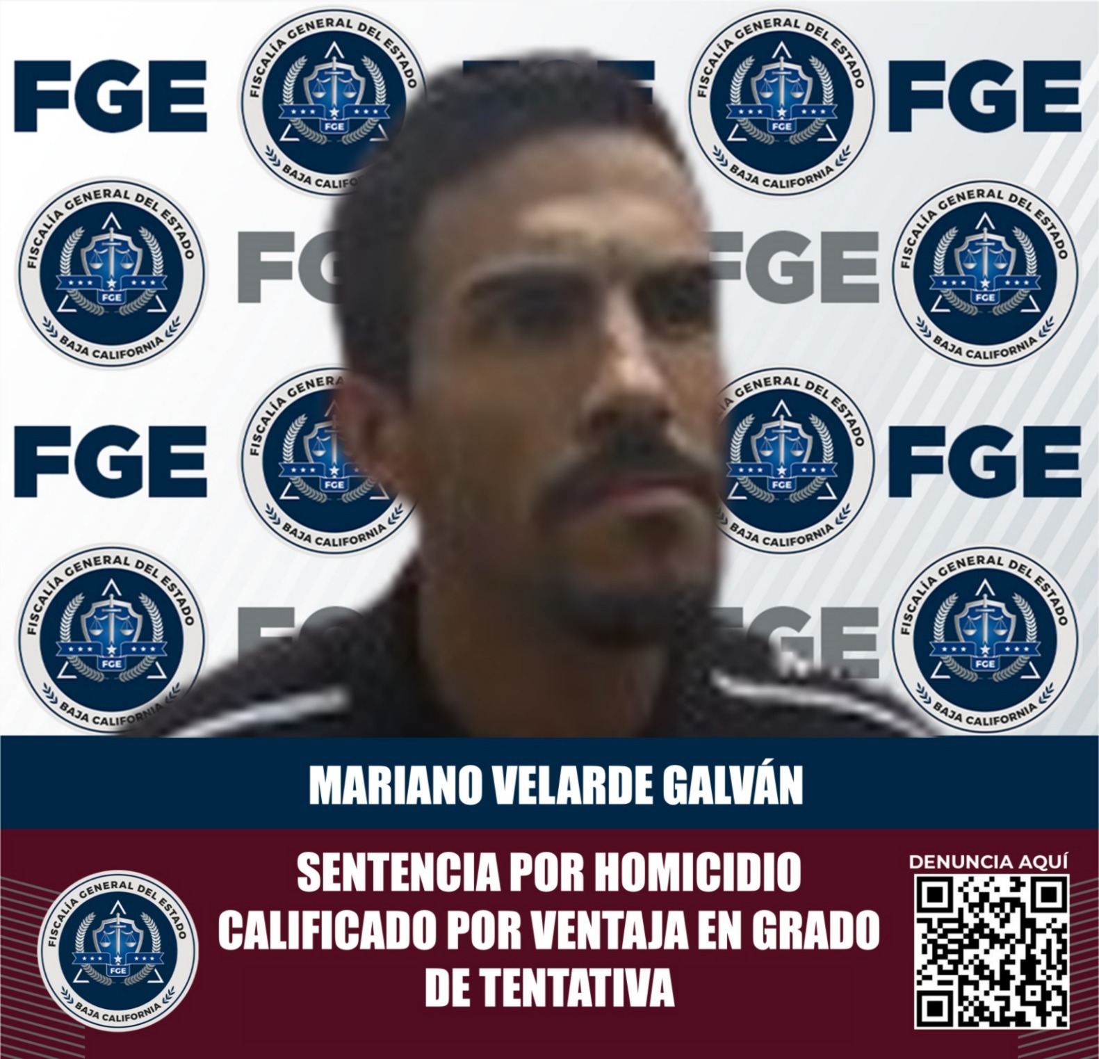TIJUANA, BAJA CALIFORNIA. - La Fiscalía General del Estado de Baja California (FGEBC) obtuvo la sentencia condenatoria de 13 años y 4 meses en prisión mediante un procedimiento abreviado para Mariano Velarde Galván, alias Jesús Ochoa López, por el delito de homicidio calificado por ventaja en grado de tentativa.