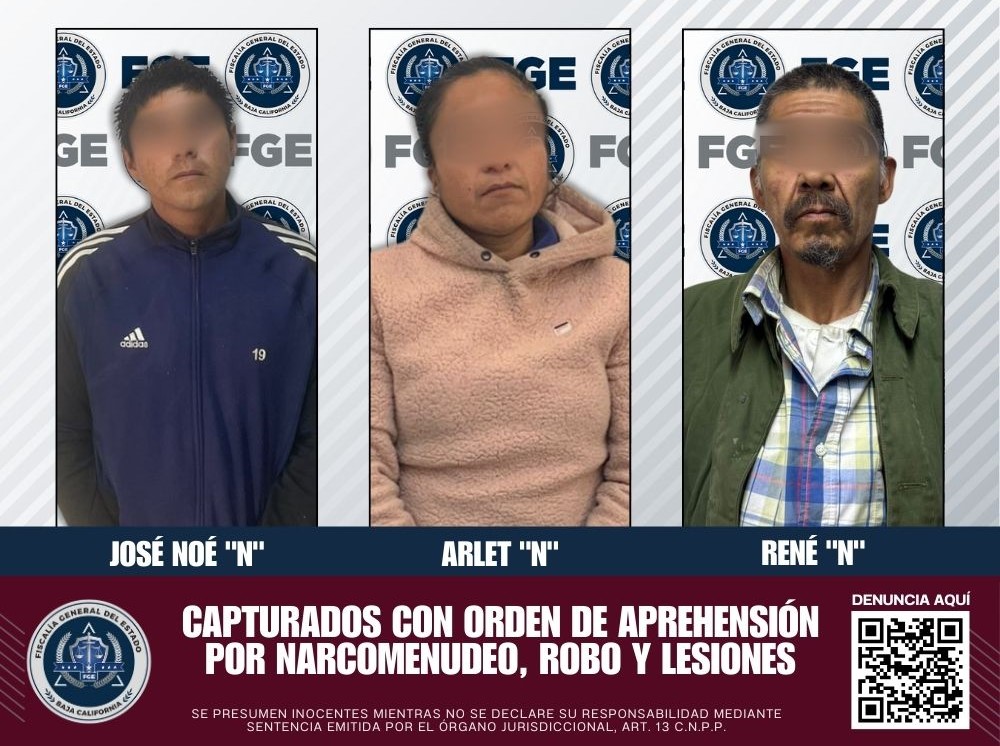 ENSENADA, BAJA CALIFORNIA. - La Fiscalía General del Estado informa que, en un operativo reciente realizado por elementos de la Agencia Estatal de Investigación, se logró la captura de tres personas que contaban con órdenes de aprehensión.