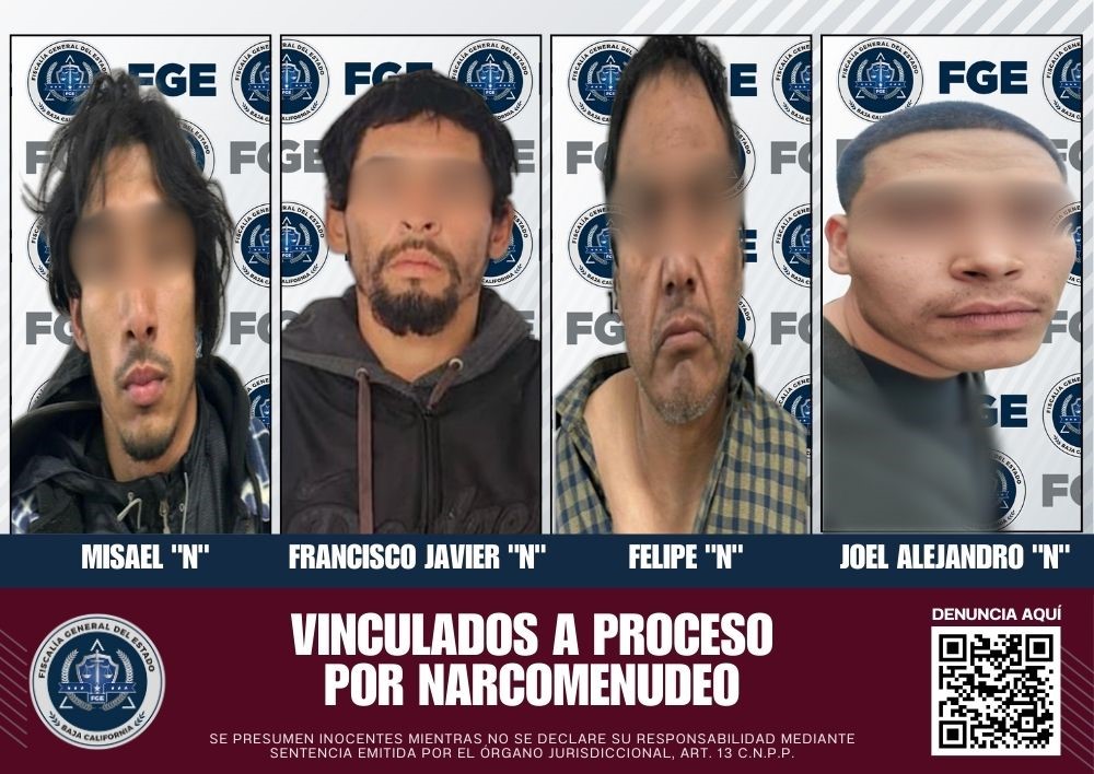 ENSENADA, BAJA CALIFORNIA. - La Fiscalía General del Estado, gracias a los datos de prueba presentados por el agente del Ministerio Público, logró la vinculación a proceso y la imposición de diversas medidas cautelares para cuatro personas acusadas de narcomenudeo.