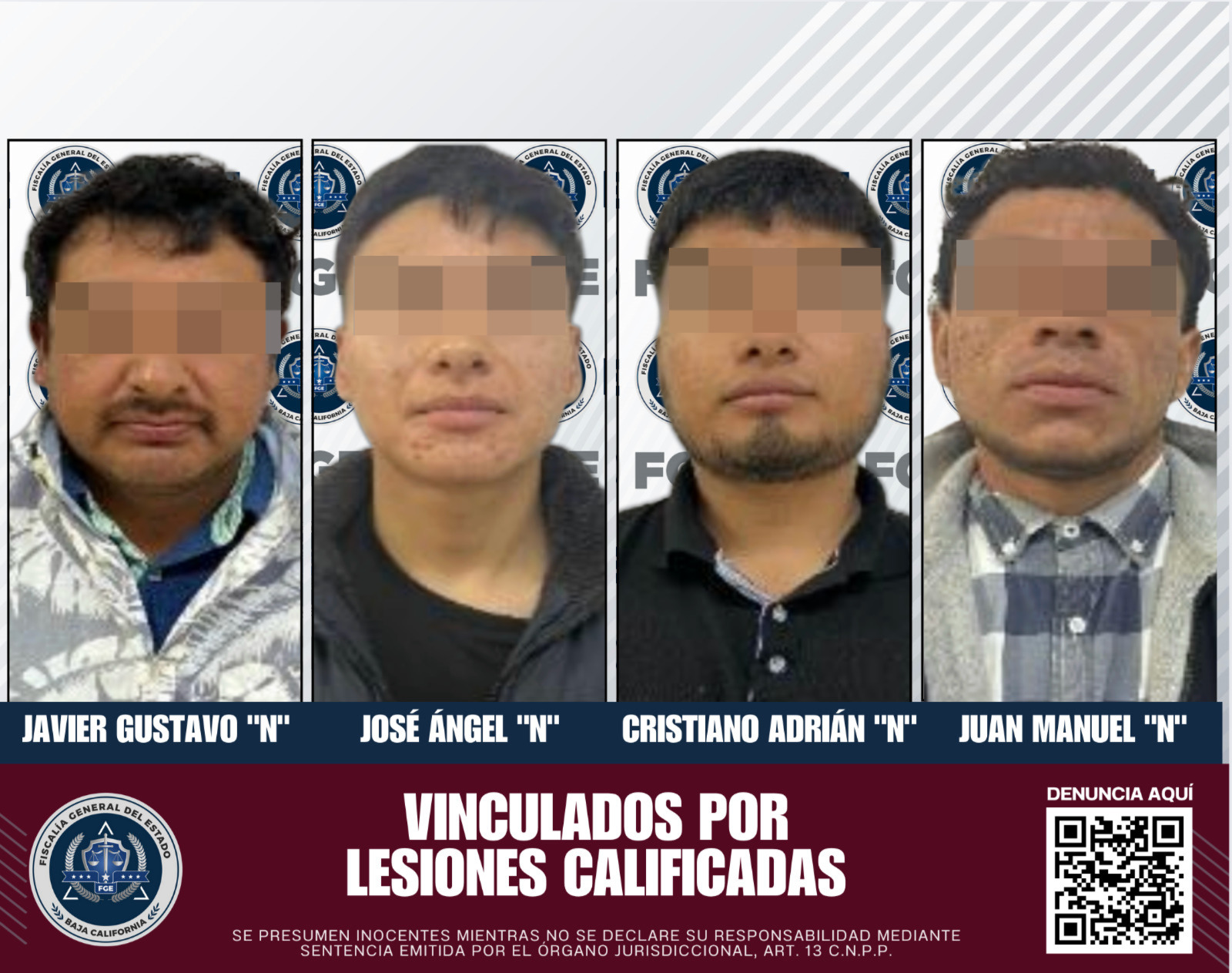 SAN QUINTÍN, BAJA CALIFORNIA. - La Fiscalía Regional de San Quintín logró la vinculación a proceso de cuatro individuos por el delito de lesiones calificadas, en relación a un hecho ocurrido el 10 de octubre de 2024 en un domicilio de la colonia Las Flores.
