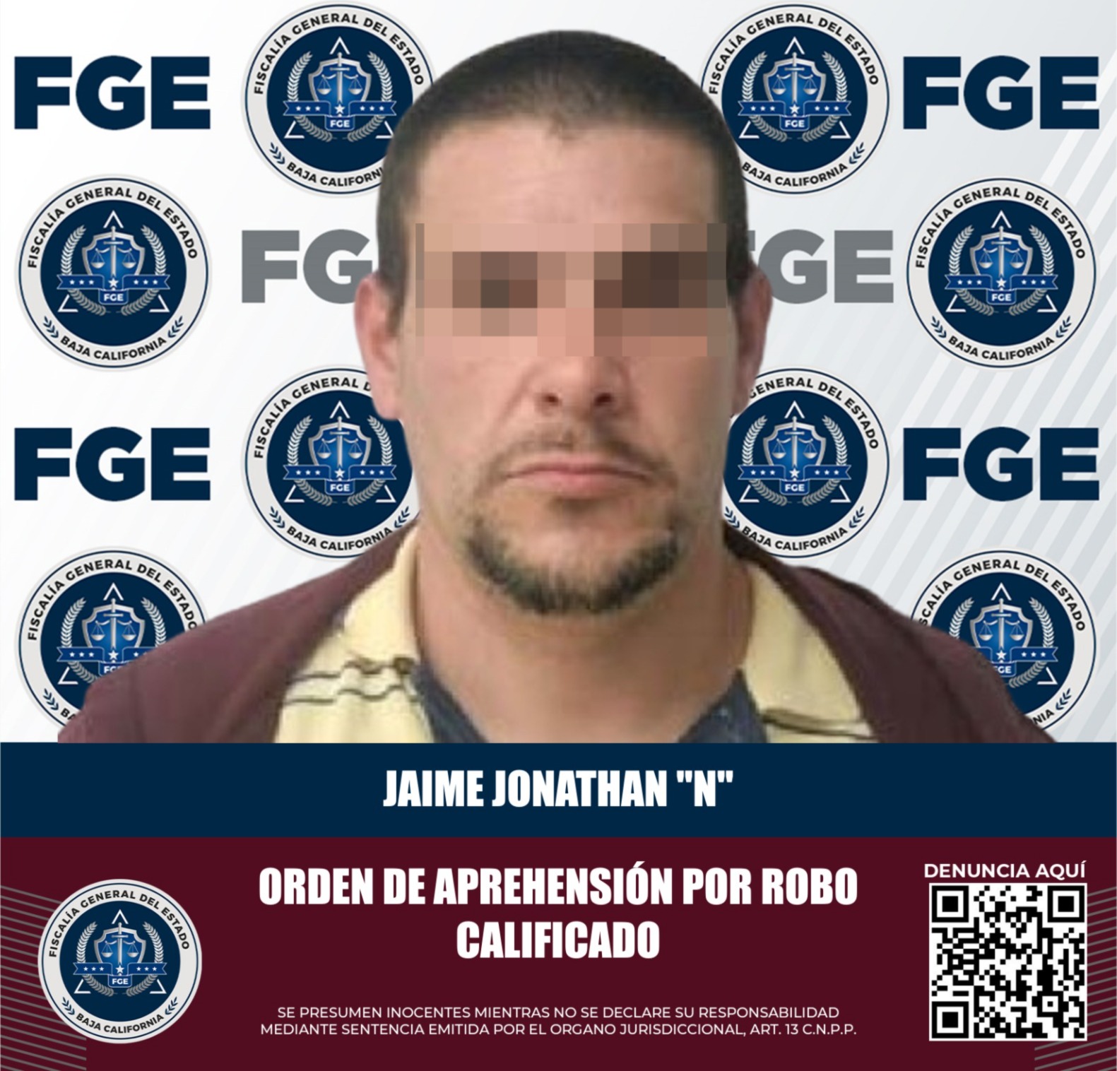 TECATE, BAJA CALIFORNIA. - La Fiscalía Regional de Tecate, dio a conocer que gracias a las acciones de inteligencia de la Agencia Estatal de Investigación (AEI) Zona Tecate, se logró cumplimentar una orden de aprehensión que pesaba que contra de Jaime Jonathan “N” alias “Mayimbu”, a quien se le señala por su presunta participación en el delito de robo calificado a lugar cerrado.