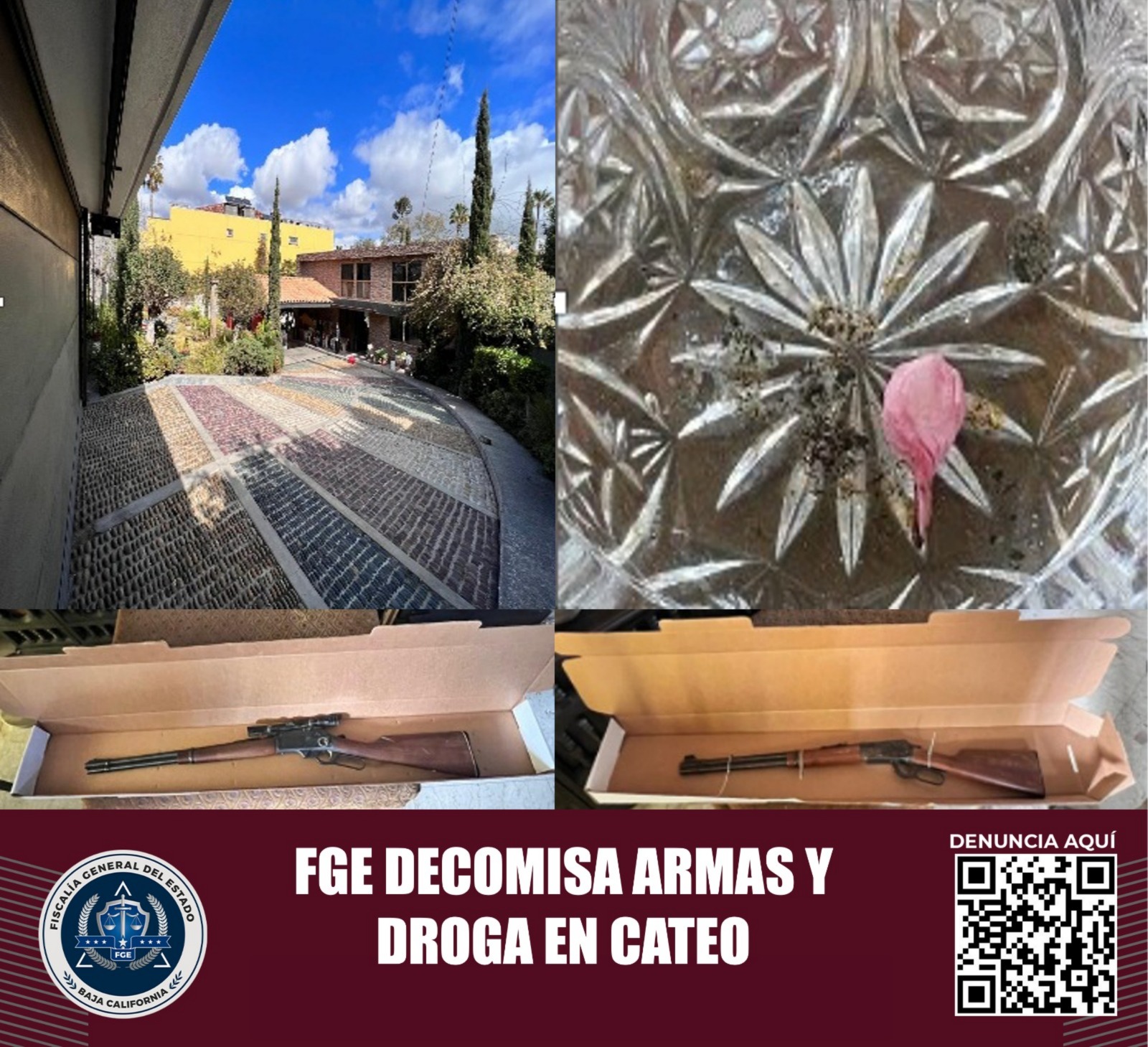 TIJUANA, BAJA CALIFORNIA. - Como parte de las acciones en combate a la delincuencia, la Fiscalía General del Estado (FGE) ejecutó un cateo en un domicilio ubicado en la Calle Parral del Fraccionamiento Chapultepec, en Tijuana, logrando el aseguramiento de armas de fuego y droga.