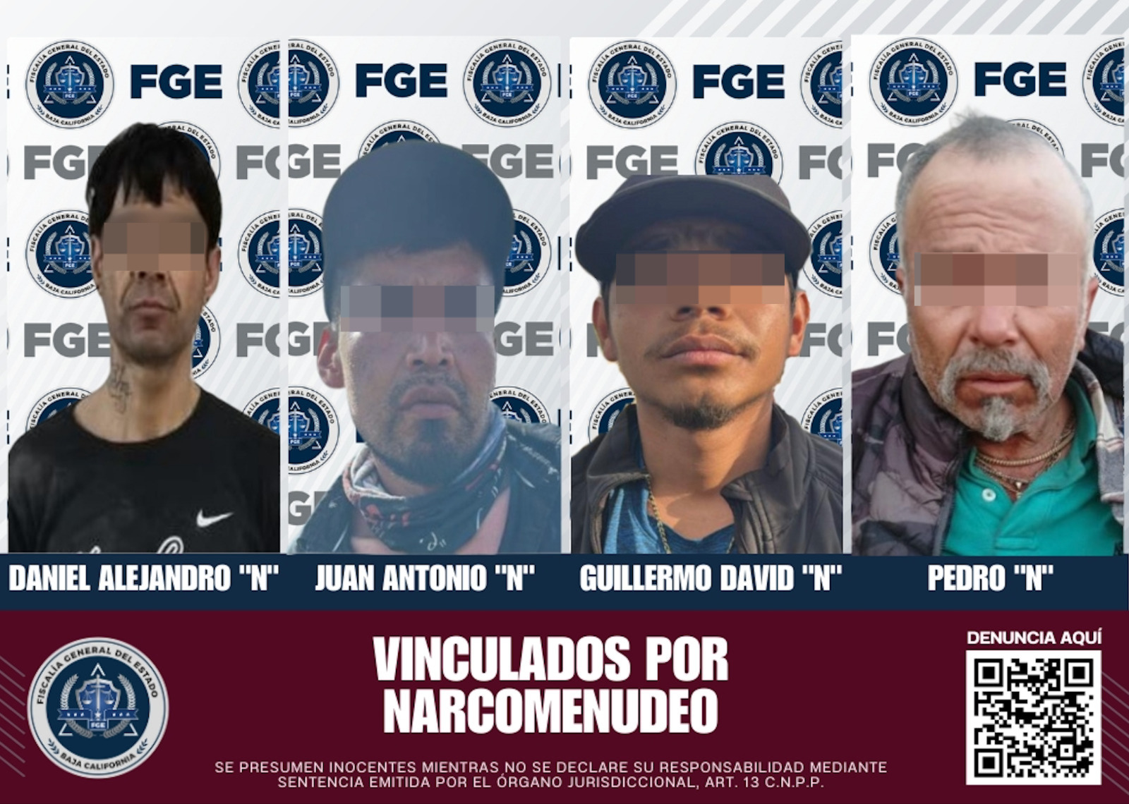 ENSENADA, BAJA CALIFORNIA. - La Fiscalía General del Estado, a través de los datos de prueba expuestos por el Ministerio Público, ha logrado la vinculación a proceso y la imposición de medidas cautelares contra cuatro individuos acusados de narcomenudeo en diversas localidades de Ensenada.
