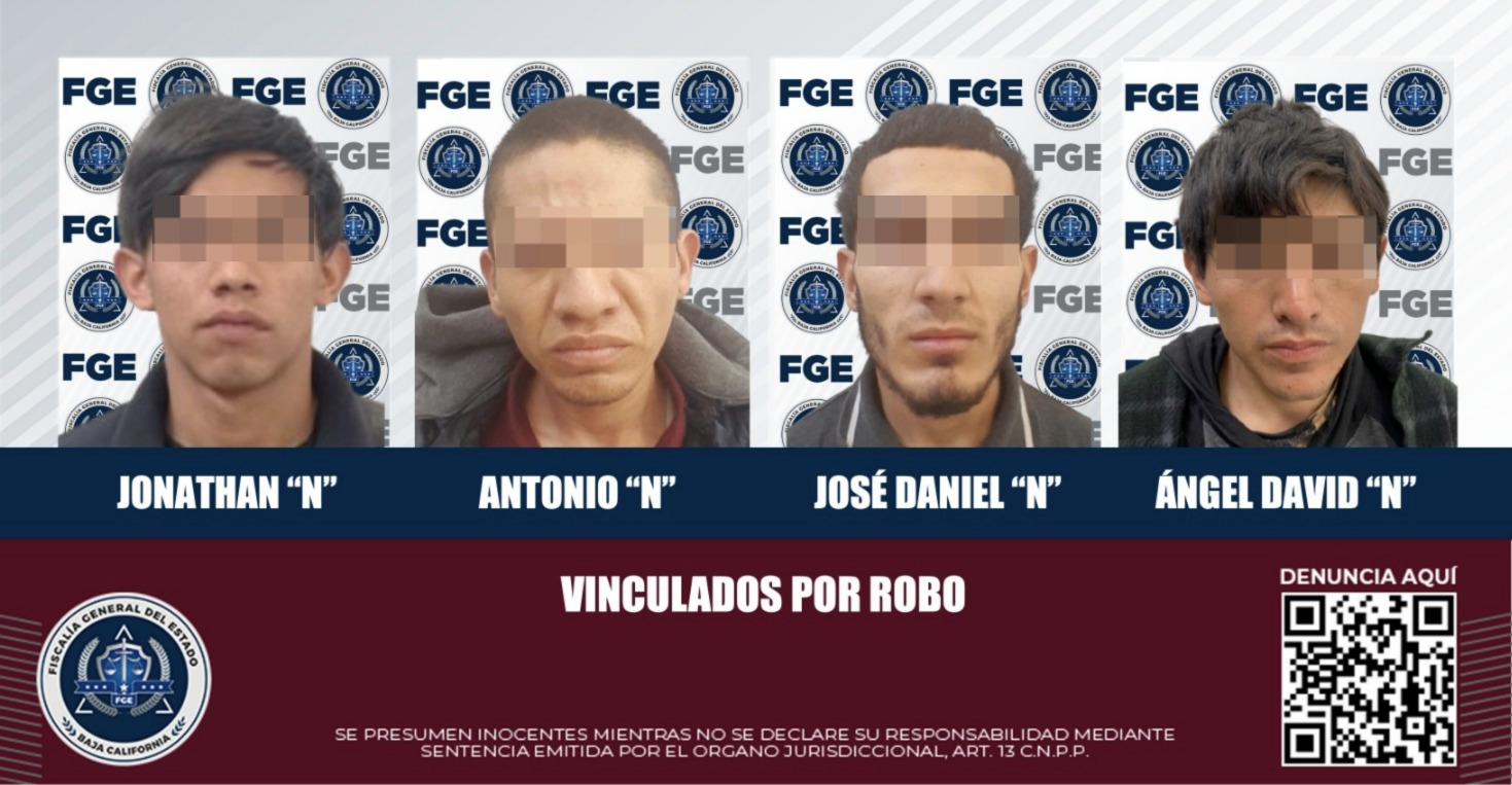 MEXICALI, BAJA CALIFORNIA. - La Fiscalía Regional de Mexicali, a través de la Unidad de Investigación de Delitos con Detenidos Poniente, logró la vinculación a proceso de cuatro sujetos acusados de cometer robos con violencia en establecimientos comerciales.