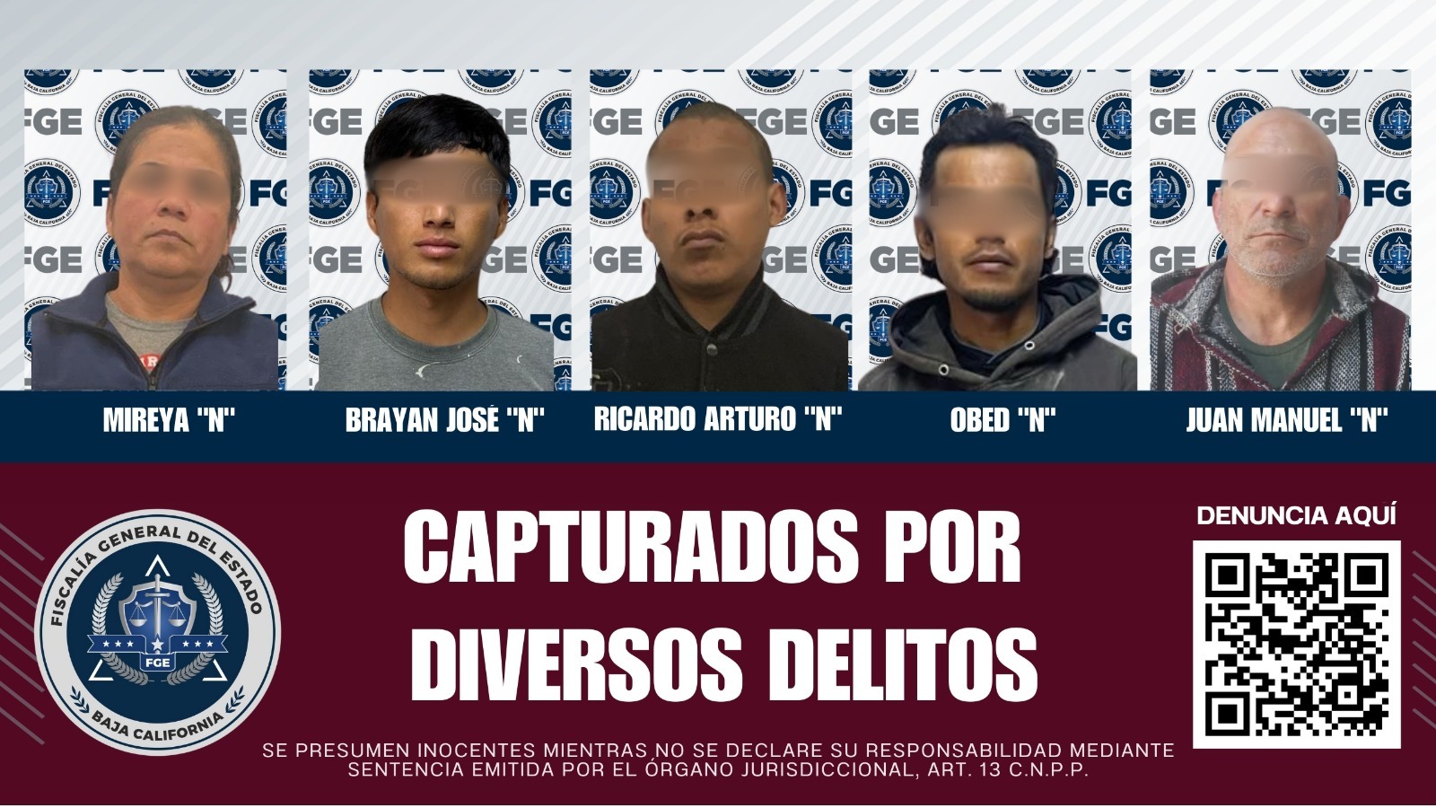 ENSENADA, BAJA CALIFORNIA. - La Fiscalía General del Estado (FGE), a través de la Agencia Estatal de Investigación (AEI), llevó a cabo la detención de cinco personas con orden de aprehensión por diversos delitos cometidos en la ciudad de Ensenada.