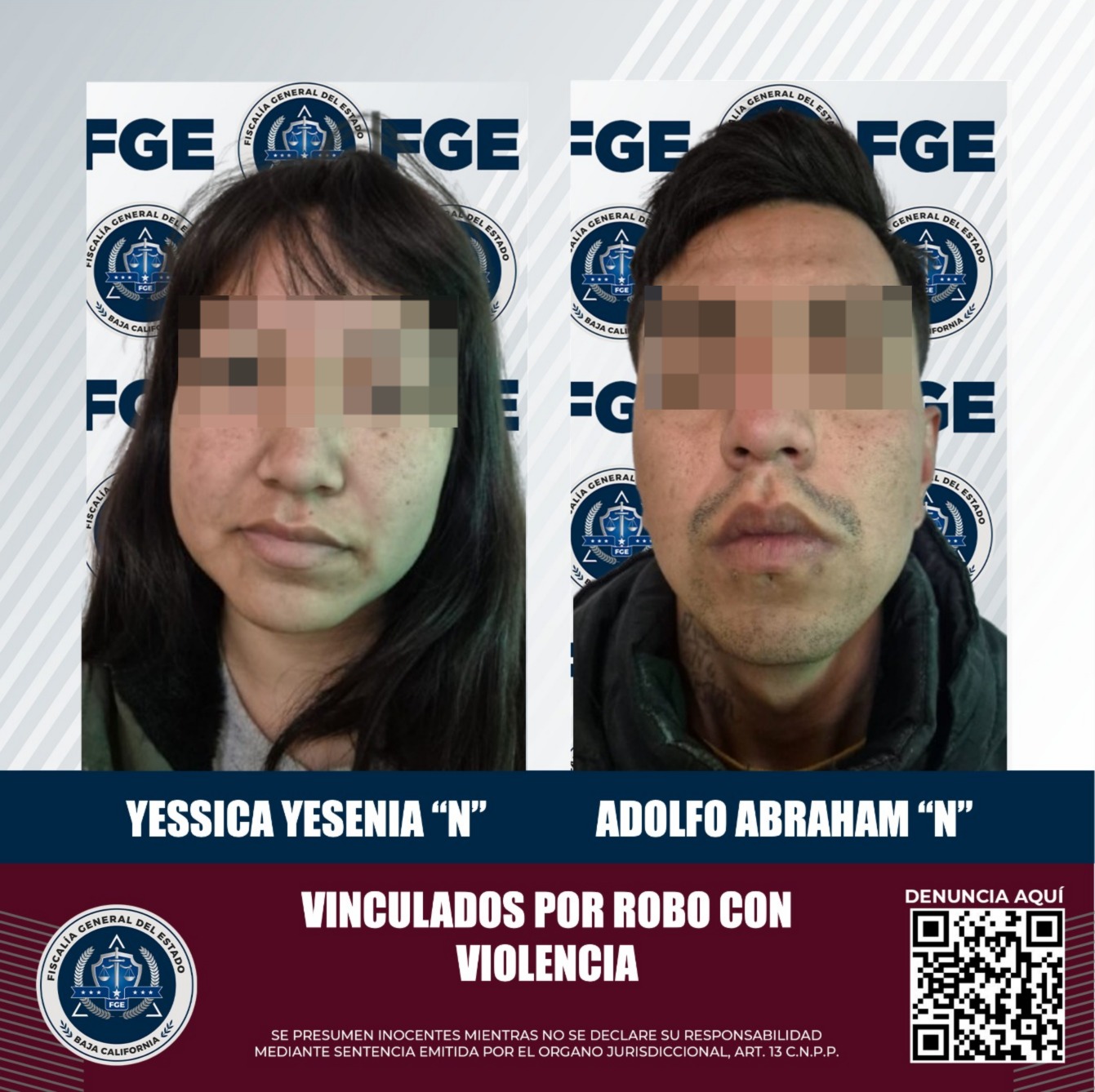 MEXICALI, BAJA CALIFORNIA. - Derivado del resultado del trabajo de investigación realizado por la Fiscalía Regional de Mexicali, una pareja presuntamente relacionada en un robo a establecimiento comercial con violencia fue vinculada a proceso penal.