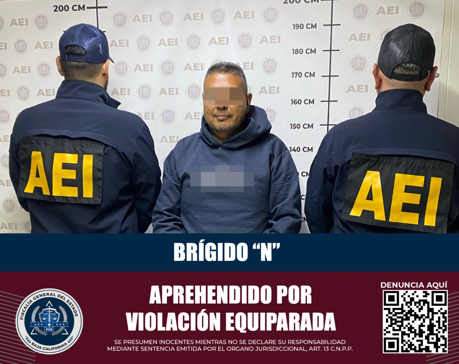 ENSENADA, BAJA CALIFORNIA. - La Fiscalía General del Estado, a través de agentes de la Agencia Estatal de Investigación, ejecutó una orden de aprehensión contra un sujeto identificado como Brígido “N”, de 45 años de edad, por el delito de violación agravada.