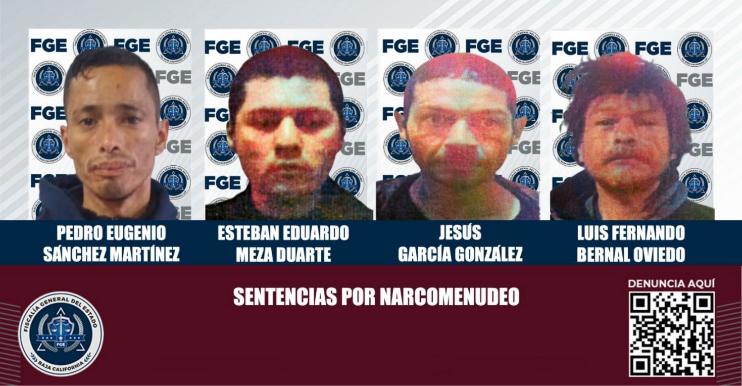 TIJUANA, BAJA CALIFORNIA. - La Fiscalía General del Estado (FGE) informa que, en cuatro casos distintos relacionados con el delito de narcomenudeo, se lograron sentencias condenatorias contra igual número de imputados, quienes fueron declarados responsables de delitos contra la salud.