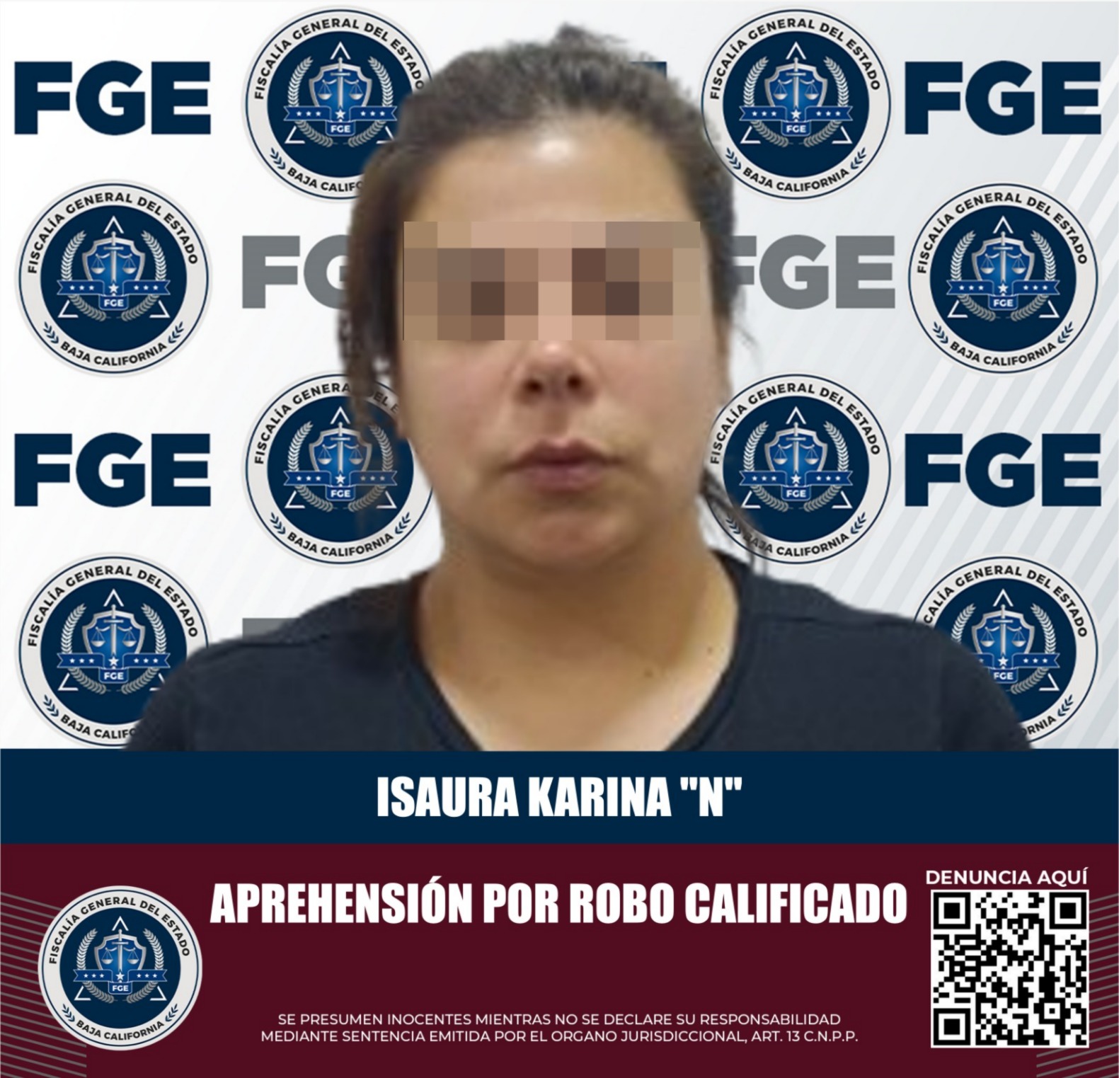 TIJUANA, BAJA CALIFORNIA. - La Fiscalía Regional de Tijuana, dio a conocer que mediante acciones de inteligencia e información recabada en gabinete y campo, se logró cumplimentar una orden de aprehensión en contra de Isaura Karina “N”, por su probable responsabilidad en el delito de robo calificado a establecimiento comercial abierto al público.