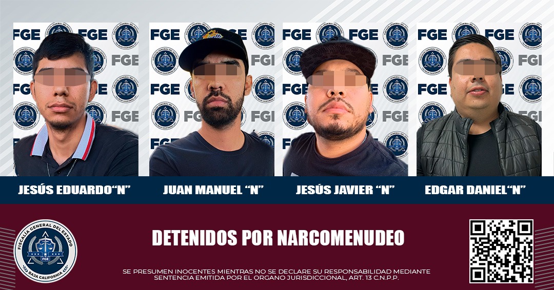 Por lo anterior fueron asegurados Edgar Daniel “N”, Jesús Javier “N”, Juan Manuel “N” y Jesús Eduardo “N”, quienes se encontraban en el inmueble cateado. Los detenidos y la droga fueron trasladados a las instalaciones de la Fiscalía Especializada en Narcomenudeo.