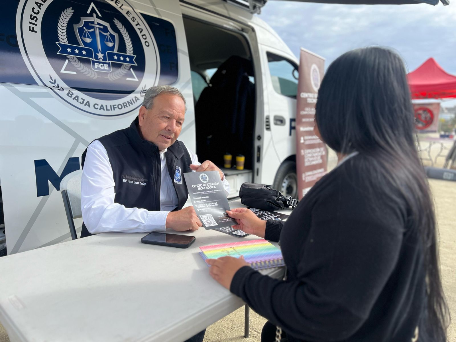 TIJUANA, BAJA CALIFORNIA. - Con el firme compromiso de garantizar la atención ciudadana con calidad humana, la Fiscalía General del Estado (FGE), bajo la dirección de la Dra. Ma. Elena Andrade Ramírez, continúa con la instalación de los módulos de información y atención del Centro de Atención Tecnológica en diversos puntos de la ciudad.