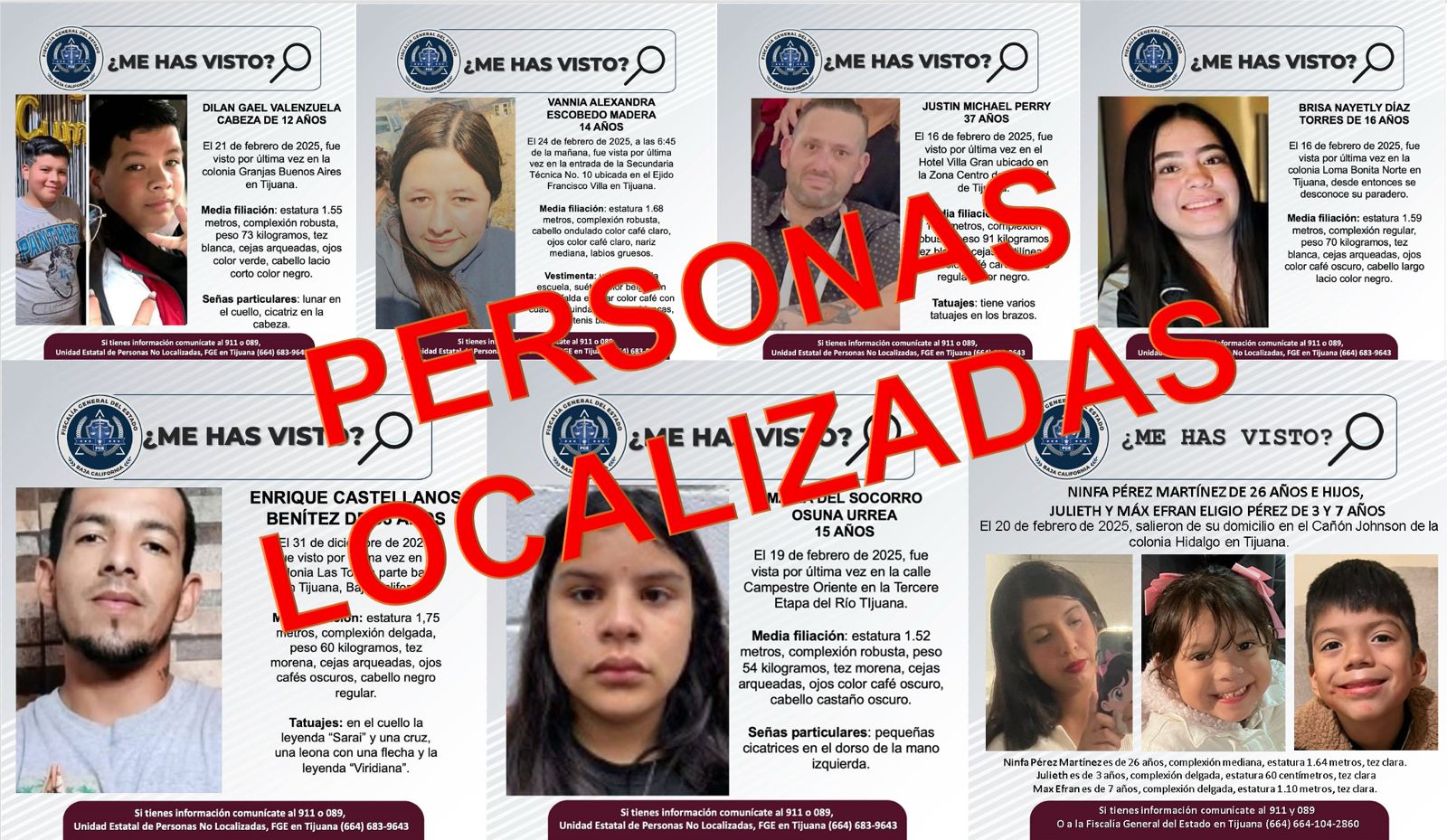 Las personas localizadas son Dilan Gael Valenzuela Cabeza de 12 años, Vannia Alexandra Escobedo Madera de 14 años, Justin Michael Perry de 37 años, Brisa Nayetly Días Torres de 16 años, Enrique Castellanos Benitez de 33 años, María del Socorro Osuna Urrea de 15 años, Ninfa Pérez Martínez de 26 años y sus hijos Max y Julieth de 7 y 3 años de edad.