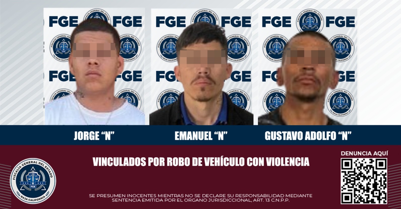 MEXICALI, BAJA CALIFORNIA. - Con base en los elementos de prueba presentados ante el juez por la Fiscalía Regional de Mexicali, se logró la vinculación a proceso penal de tres hombres acusados de robo de vehículo y robo de vehículo con violencia, además de imponerles prisión preventiva como medida cautelar.