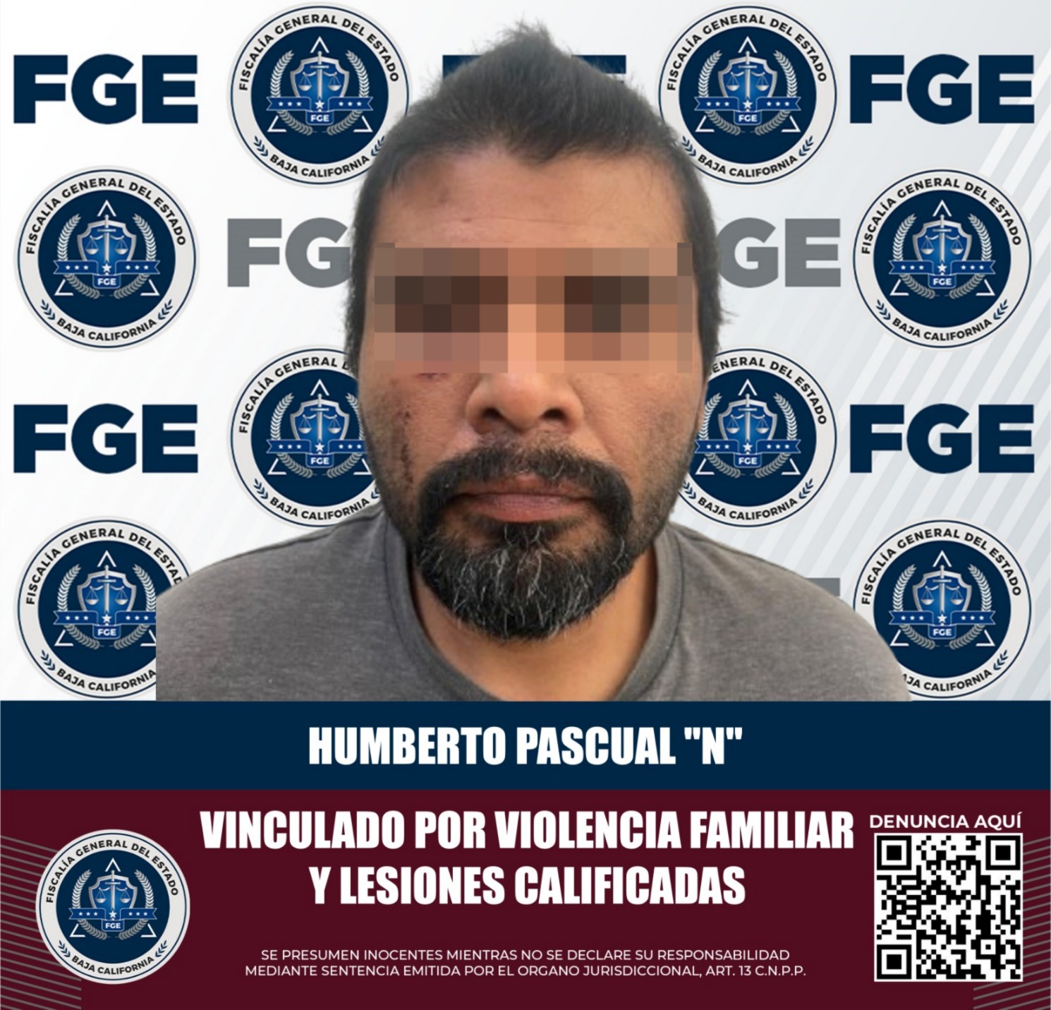 MEXICALI, BAJA CALIFORNIA. - La Fiscalía Regional de Mexicali, a través de la Unidad de Investigación con Detenidos Poniente, logró la vinculación a proceso de Humberto Pascual “N”, acusado de los delitos de violencia familiar equiparada y lesiones calificadas.