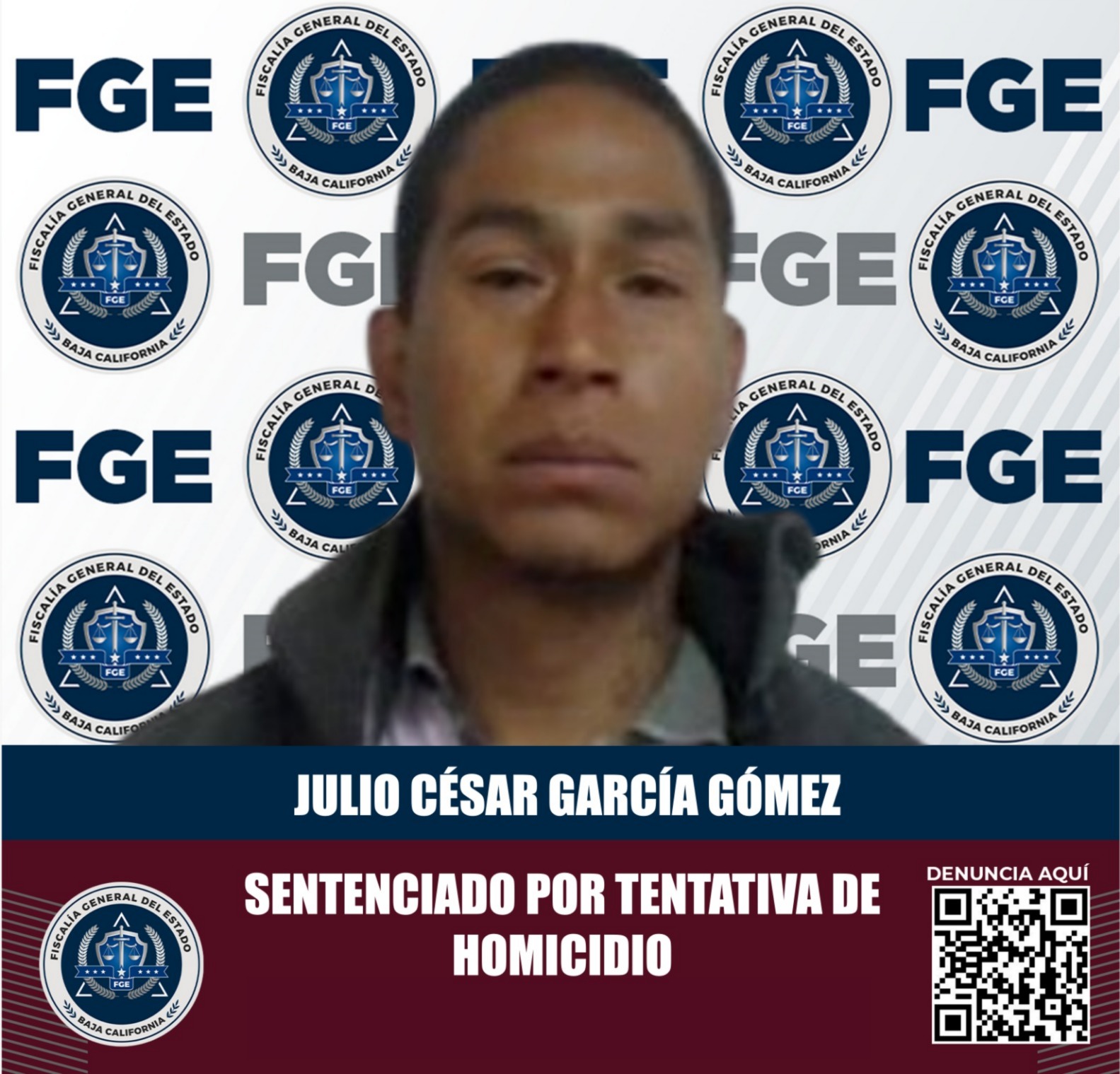 TIJUANA, BAJA CALIFORNIA. - La Fiscalía General del Estado (FGE), a través de la Fiscalía Especializada en Delitos Contra la Vida, celebró un procedimiento abreviado en contra de Julio César García Gómez, responsable de homicidio calificado con ventaja en grado de ejecución de tentativa, condenándolo a una pena de 13 años y 4 meses en prisión.