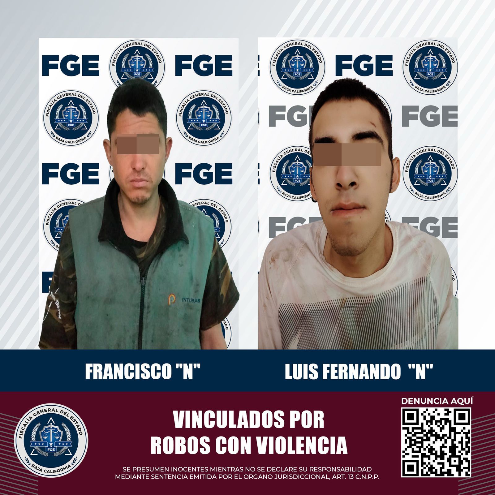 MEXICALI, BAJA CALIFORNIA. - La Fiscalía Regional de Mexicali, a través de las unidades de Investigación de Robos Oriente y Detenidos Oriente, logró la vinculación a proceso de dos hombres acusados de cometer robos con violencia en establecimientos comerciales.