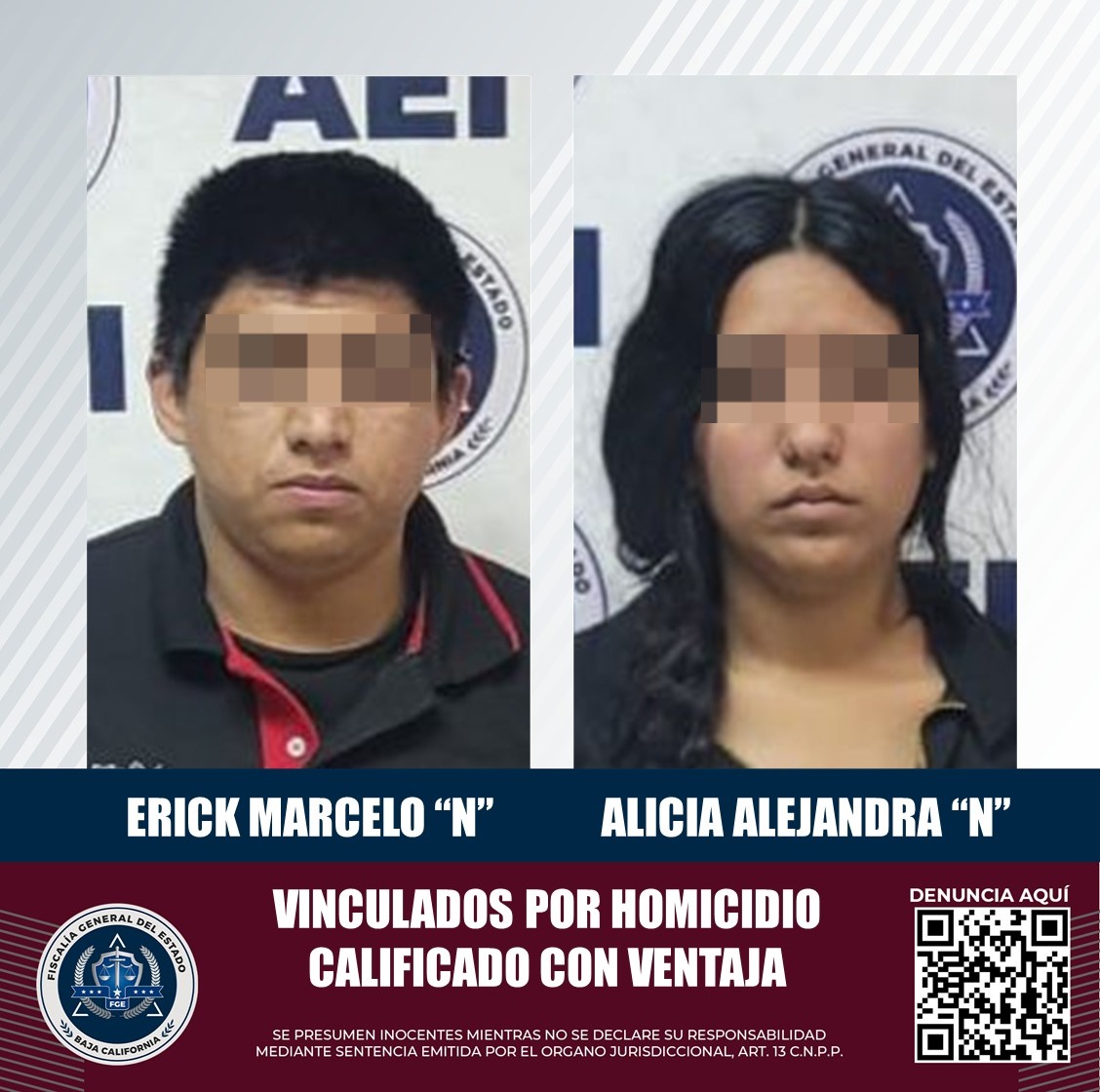 TIJUANA, BAJA CALIFORNIA. - La Fiscalía General del Estado (FGE), informa sobre la vinculación a proceso de Erick Marcelo "N" y Alicia Alejandra "N" por el delito de homicidio calificado con ventaja.